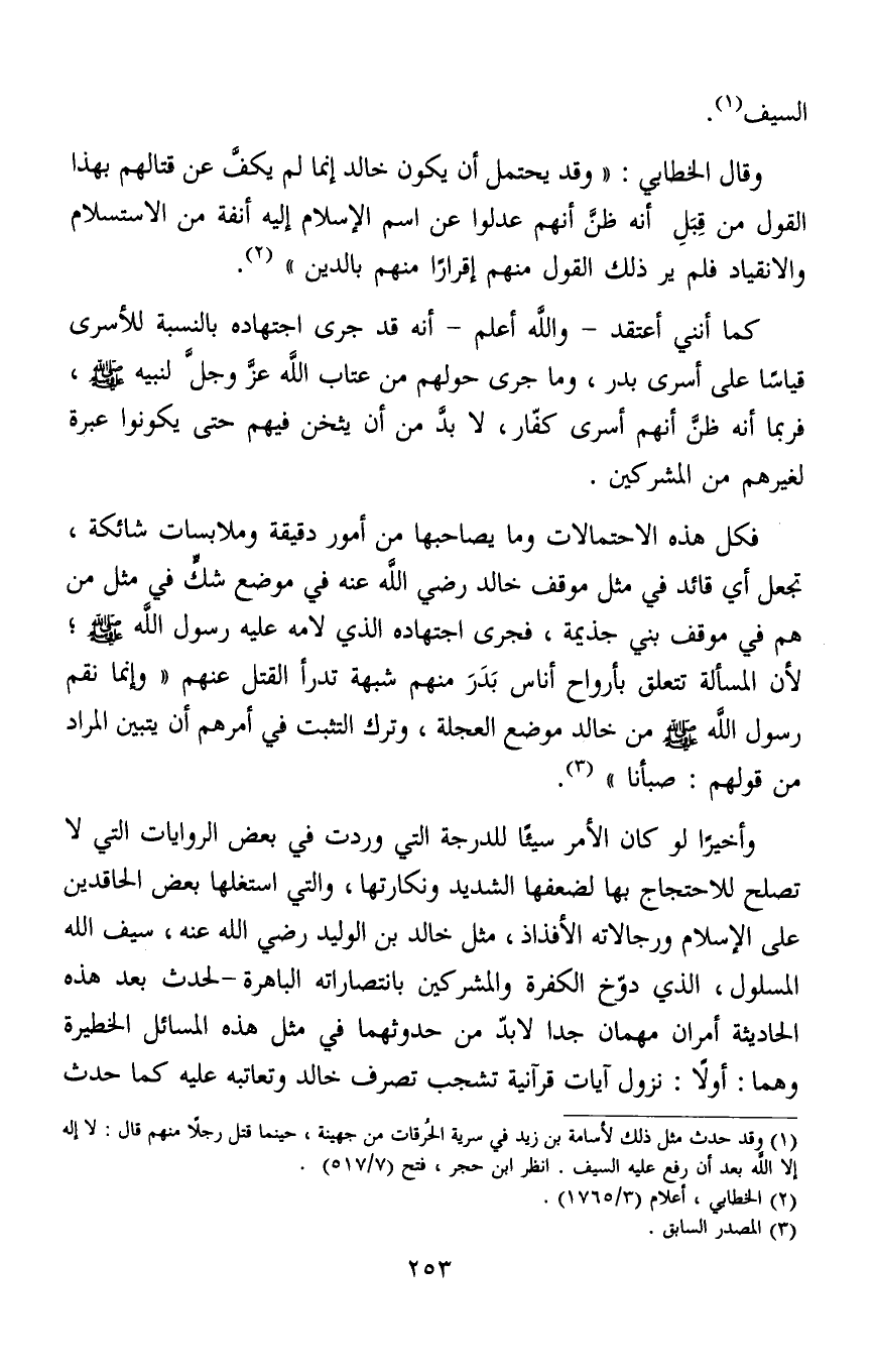 وقال الخطابي: "وقد يحتمل أن يكون خالد إنما لم يكفَّ عن قتالهم بهذا القول من قِبَلِ أنه ظنَّ أنهم عدلوا عن اسم الإسلام إليه أنفة من الاستسلام والانقياد فلم ير ذلك القول منهم إقرارا منهم بالدين"2.