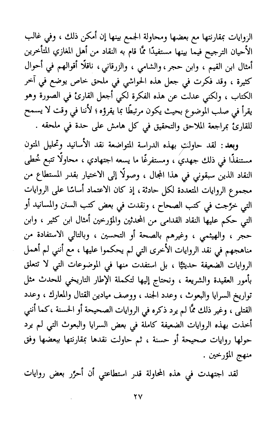 الروايات بمقارنتها مع بعضها ومحاولة الجمع بينها إن أمكن ذلك، وفي غالب الأحيان الترجيح فيما بينها مستفيدًا ممَّا قام به النقاد من أهل المغازي المتأخرين أمثال ابن القيم، وابن حجر، والشامي، والزرقاني، ناقلا أقوالهم في أحوال كثيرة، وقد فكرت في جعل هذه الحواشي في ملحق خاص يوضع في آخر الكتاب، ولكني عدلت عن هذه الفكرة لكي أجعل القارىء في الصورة وهو يقرأ في صلب الموضوع بحيث يكون مرتبطا بما يقرؤه؛ لأننا في وقت لا يسمح للقارىء بمراجعة الملاحق والتحقيق في كل هامش على حدة في ملحقه.