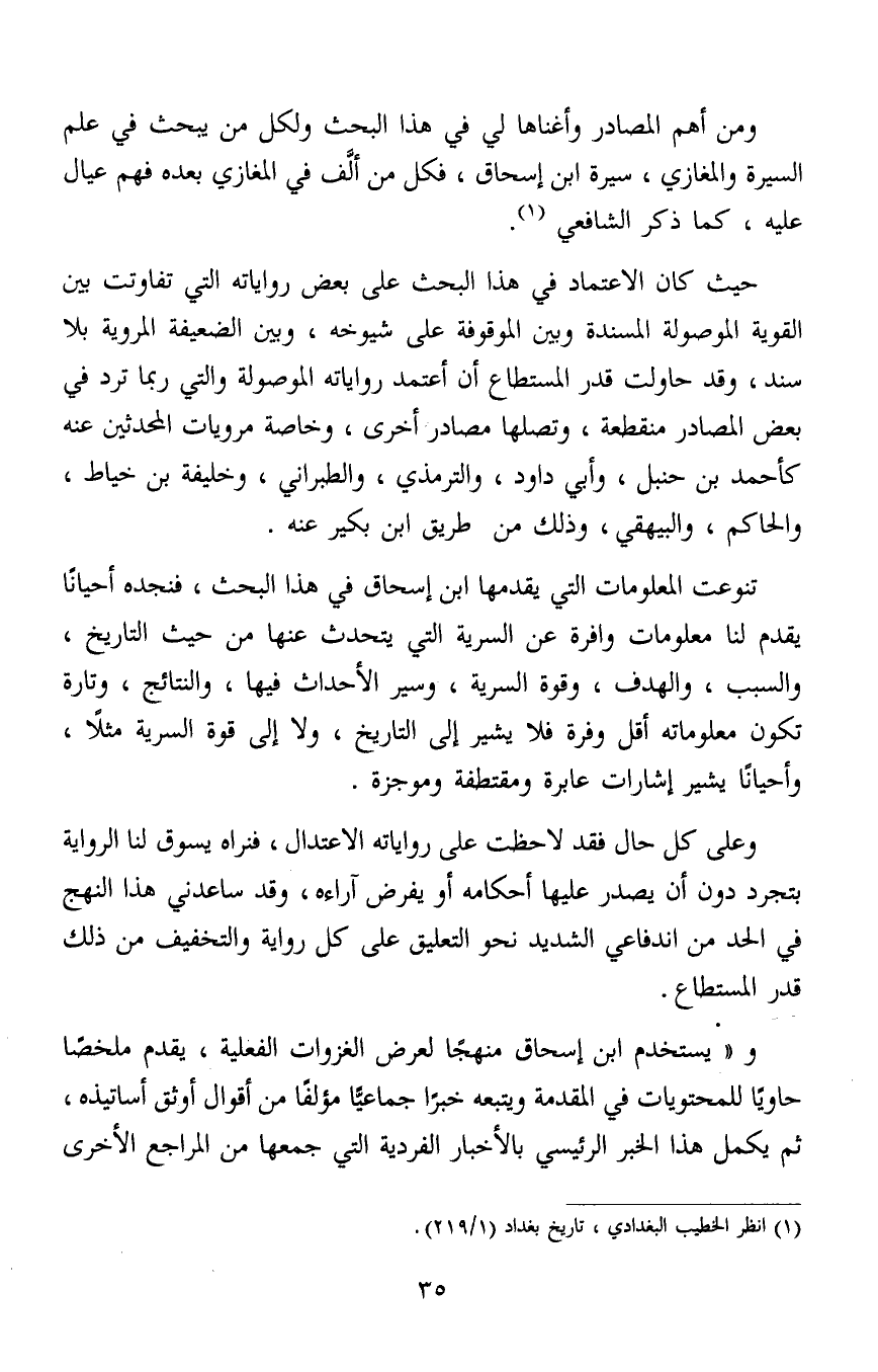 ومن أهم المصادر وأغناها لي في هذا البحث ولكل من يبحث في علم السيرة والمغازي، سيرة ابن إسحاق، فكل من ألَّف في المغازي بعده فهم عيال عليه، كما ذكر الشافعي1.