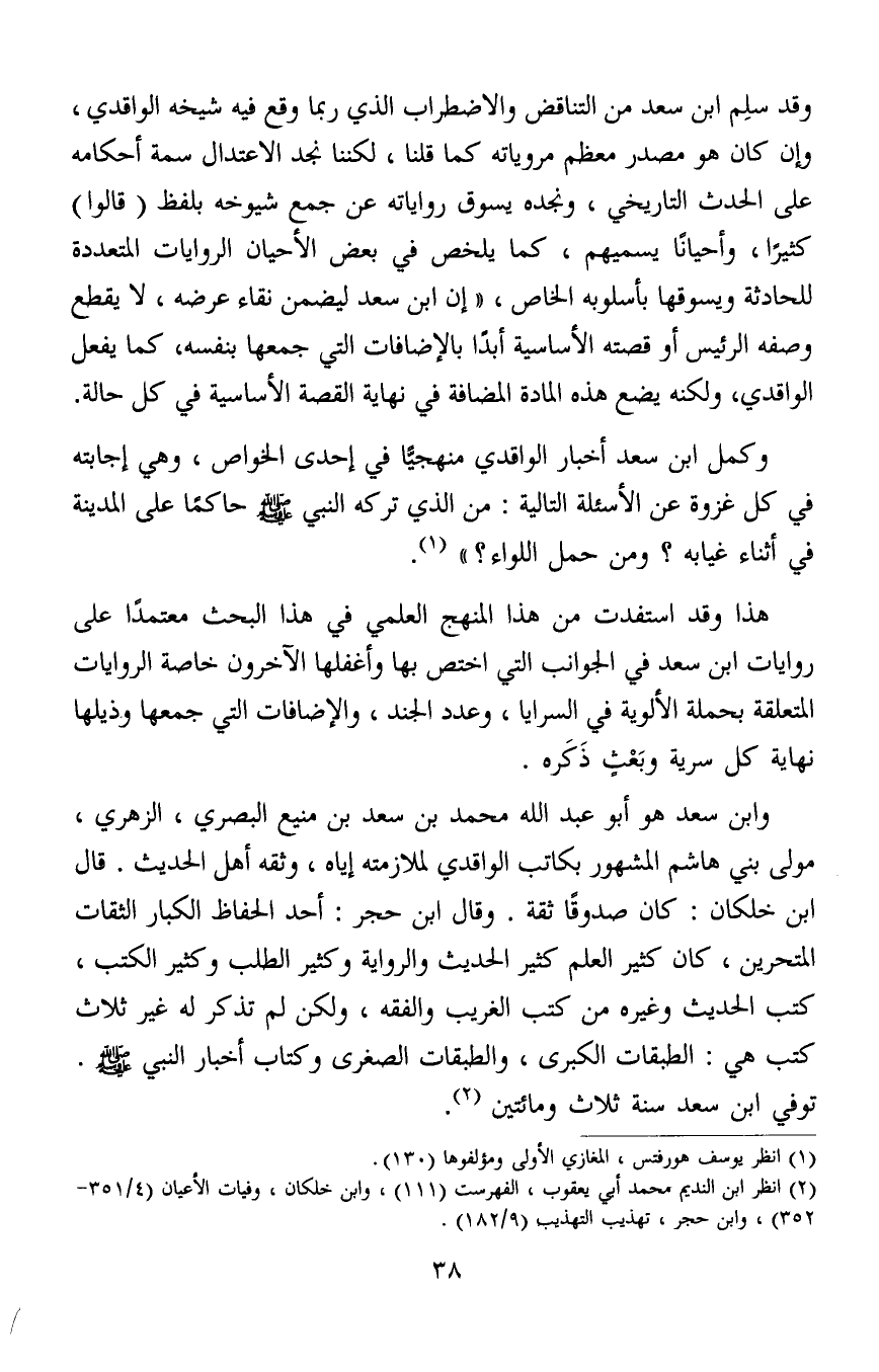 وابن سعد هو أبو عبد الله محمد بن سعد بن منيع البصري، الزهري، مولى بني هاشم المشهور بكاتب الواقدي لملازمته إياه، وثقه أهل الحديث. قال ابن خلكان: كان صدوقًا ثقة. وقال ابن حجر: أحد الحفاظ الكبار الثقات المتحرين، كان كثير العلم كثير الحديث والرواية وكثير الطلب وكثير الكتب، كتب الحديث وغيره من كتب الغريب والفقه، ولكن لم تذكر له غير ثلاث كتب هي: الطبقات الكبرى، والطبقات الصغرى وكتاب أخبار النبي صلى الله عليه وسلم توفي ابن سعد سنة ثلاث ومائتين2.