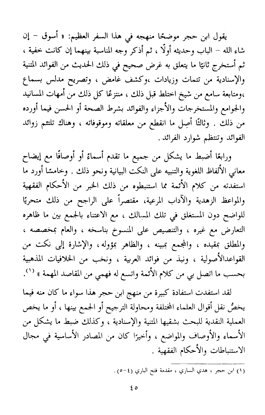 لقد استفدت استفادة كبيرة من منهج ابن حجر هذا سواء ما كان منه فيما يخصُّ نقل أقوال العلماء المختلفة ومحاولة الترجيح أو الجمع بينها، أو ما يخص العملية النقدية للبحث بشقيها المتنية والإسنادية، وكذلك ضبط ما يشكل من الأسماء والأوصاف والمواضع، وأخيرًا كان من المصادر الأساسية في مجال الاستنباطات والأحكام الفقهية.