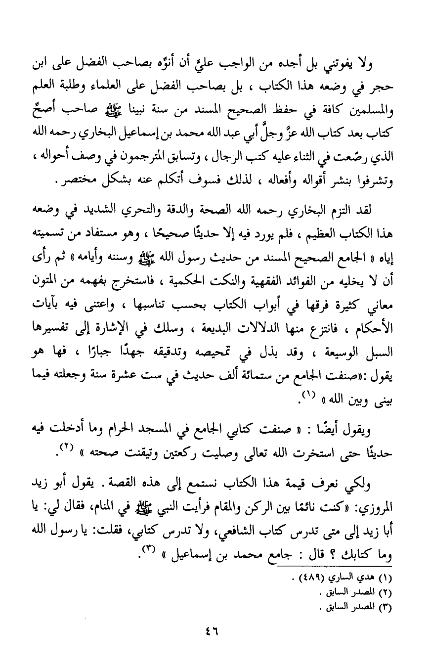 ولا يفوتني بل أجده من الواجب عليَّ أن أنوِّه بصاحب الفضل على ابن حجر في وضعه هذا الكتاب، بل بصاحب الفضل على العلماء وطلبة العلم والمسلمين كافة في حفظ الصحيح المسند من سنة نبينا صلى الله عليه وسلم صاحب أصحِّ كتاب بعد كتاب الله عزَّ وجلَّ أبي عبد الله محمد بن إسماعيل البخاري رحمه الله الذي رصّعت في الثناء عليه كتب الرجال، وتسابق المترجمون في وصف أحواله، وتشرفوا بنشر أقواله وأفعاله، لذلك فسوف أتكلم عنه بشكل مختصر.