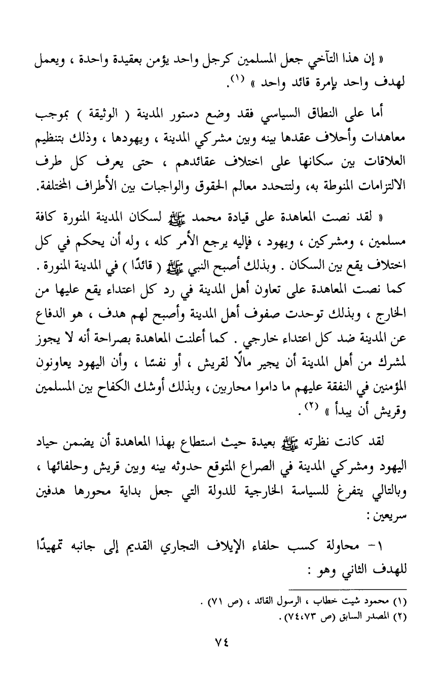 "لقد نصت المعاهدة على قيادة محمد صلى الله عليه وسلم لسكان المدينة المنورة كافة مسلمين، ومشركين، ويهود، فإليه يرجع الأمر كله، وله أن يحكم في كل اختلاف يقع بين السكان. وبذلك أصبح النبي صلى الله عليه وسلم (قائدًا) في المدينة المنورة.