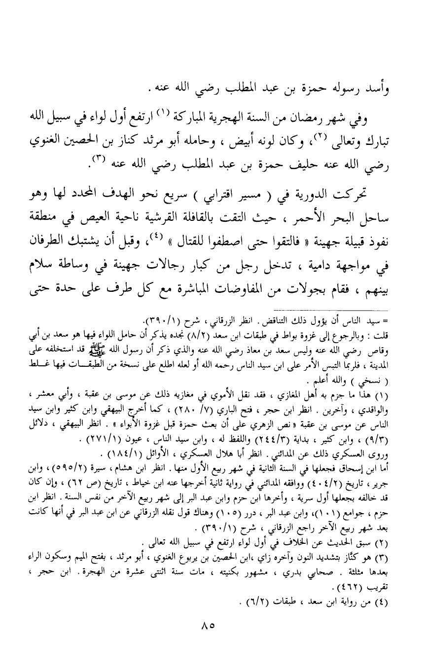 1 هذا ما جزم به أهل المغازي، فقد نقل الأموي في مغازيه ذلك عن موسى بن عقبة، وأبي معشر، والواقدي، وآخرين. انظر ابن حجر، فتح الباري (7/280) ، كما أخرج البيهقي وابن كثير وابن سيد الناس عن موسى بن عقبة "نص الزهري على أن بعث حمزة قبل غزوة الأبواء". انظر البيهقي، دلائل (3/9) ، وابن كثير، بداية (3/244) واللفظ له، وابن سيد الناس، عيون (1/271) .