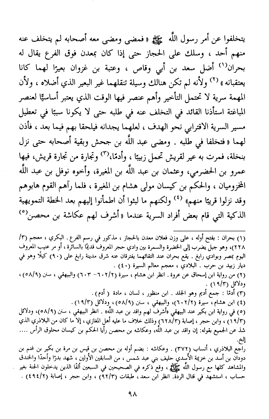 5 في رواية ابن بكير عند البيهقي "أشرف لهم واقد بن عبد الله". انظر البيهقي، سنن (9/58) ، ودلائل (3/19) ، وابن حجر، إصابة (3/628) وذلك خلاف ما عليه أهل المغازي، إلا ما كان من البلاذري الذي شذ عن الجميع بقوله: إن واقد بن عبد الله، وعكاشة بن محصن رأيا الحكم بن كيسان محلوق الرأس.... إلخ.
