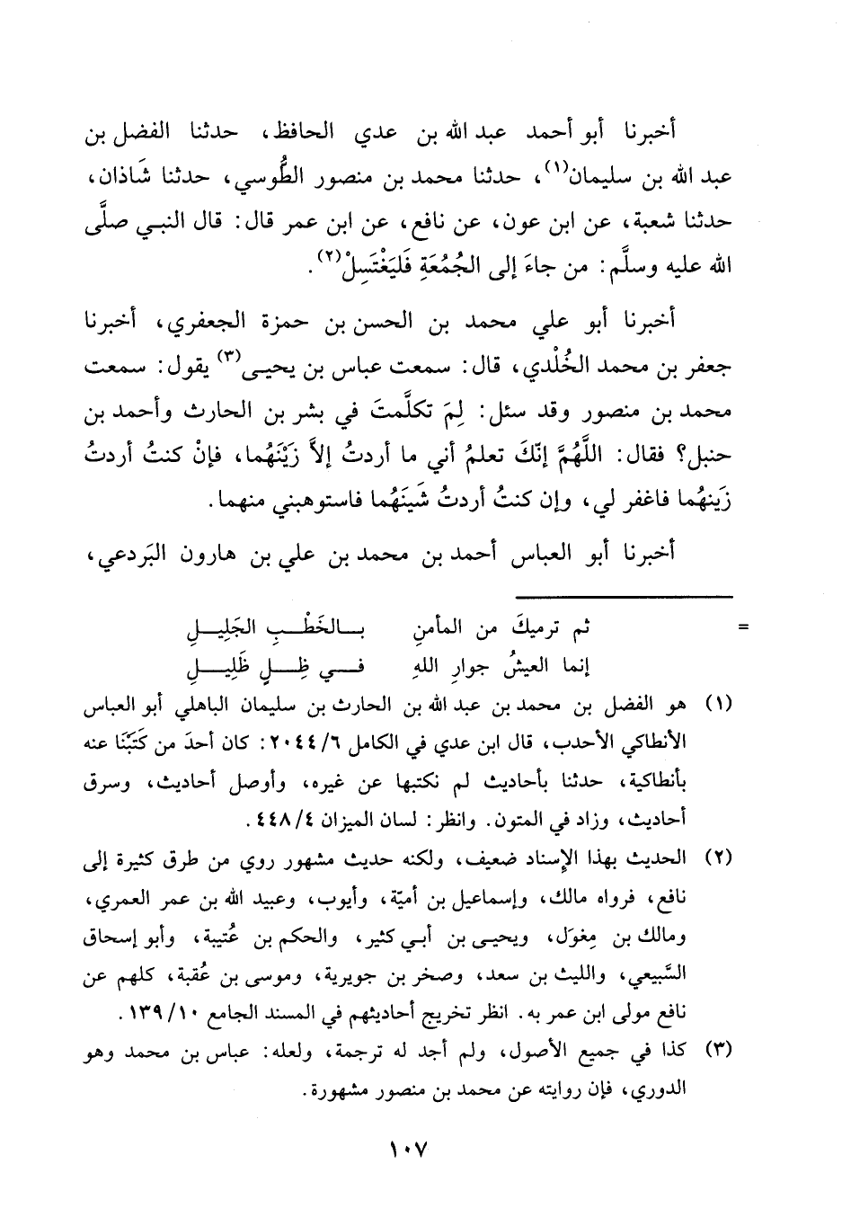 أَخْبَرَنَا أَبُو أَحْمَدَ عَبْدُ اللَّهِ بْنُ عَدِيٍّ الْحَافِظُ، حَدَّثَنَا الْفَضْلُ بْنُ عَبْدِ اللَّهِ بْنِ سُلَيْمَانَ، حَدَّثَنَا مُحَمَّدُ بْنُ مَنْصُورٍ الطُّوسِيُّ، حَدَّثَنَا شَاذَانُ، حَدَّثَنَا شُعْبَةُ، عَنِ ابْنِ عَوْنٍ، عَنْ نَافِعٍ، عَنِ ابْنِ عُمَرَ، قَالَ: قَالَ النَّبِيُّ صَلَّى اللَّهُ عَلَيْهِ وَسَلَّمَ: §«مَنْ جَاءَ إِلَى الْجُمُعَةِ فَلْيَغْتَسِلْ»