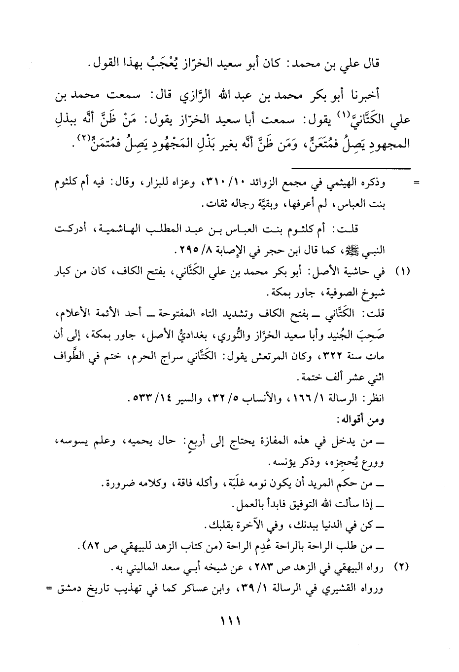 أَخْبَرَنَا أَبُو بَكْرٍ مُحَمَّدُ بْنُ عَبْدِ اللَّهِ الرَّازِيُّ قَالَ: سَمِعْتُ مُحَمَّدَ بْنَ عَلِيٍّ الْكَتَّانِيَّ، يَقُولُ: سَمِعْتُ أَبَا سَعِيدٍ الْخَرَّازَ، يَقُولُ: «§مَنْ ظَنَّ أَنَّهُ بِبَذْلِ الْمَجْهُودِ يَصِلُ فَمُتَعَنٍّ، وَمَنْ ظَنَّ أَنَّهُ بِغَيْرِ بَذْلِ الْمَجْهُودِ يَصِلُ فَمُتَمَنٍّ»