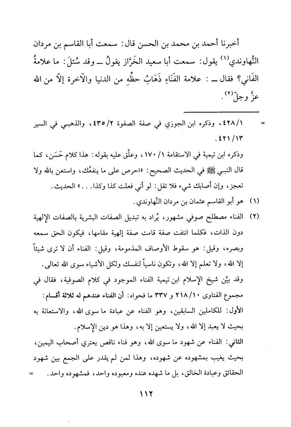 أَخْبَرَنَا أَحْمَدُ بْنُ مُحَمَّدِ بْنِ الْحَسَنِ، قَالَ: سَمِعْتُ أَبَا الْقَاسِمِ بْنَ مَرْدَانَ النُّهَاوَنْدِيَّ، يَقُولُ: سَمِعْتُ أَبَا سَعِيدٍ الْخَرَّازَ، يَقُولُ، وَقَدْ سُئِلَ: مَا عَلَامَةُ الْفَانِي؟ فَقَالَ: §«عَلَامَةُ الْفَنَاءِ ذَهَابُ حَظِّهِ مِنَ الدُّنْيَا وَالْآخِرَةِ إِلَّا مِنَ اللَّهِ عَزَّ وَجَلَّ»