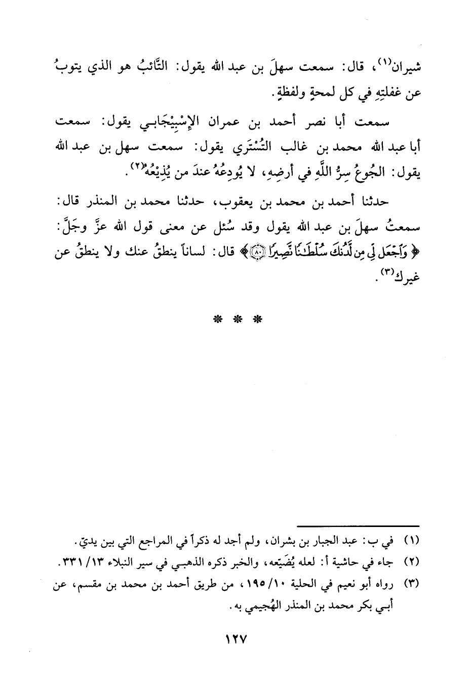 سَمِعْتُ أَبَا نَصْرٍ أَحْمَدَ بْنَ عِمْرَانَ الْإِسْبِيجَابِيَّ يَقُولُ: سَمِعْتُ أَبَا عَبْدِ اللَّهِ مُحَمَّدَ بْنَ غَالِبٍ التُّسْتَرِيَّ يَقُولُ: سَمِعْتُ سَهْلَ بْنَ عَبْدِ اللَّهِ، يَقُولُ: «§الْجُوعُ سِرُّ اللَّهِ فِي أَرْضِهِ، لَا يُودِعُهُ عِنْدَ مَنْ يُذِيعُهُ»