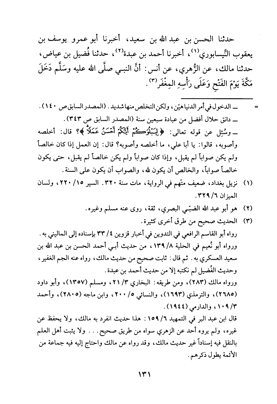حَدَّثَنَا الْحَسَنُ بْنُ عَبْدِ اللَّهِ بْنِ سَعِيدٍ، أَخْبَرَنَا أَبُو عَمْرٍو يُوسُفُ بْنُ يَعْقُوبَ النَّيْسَابُورِيُّ، أَخْبَرَنَا أَحْمَدُ بْنُ عَبْدَةَ، حَدَّثَنَا فُضَيْلُ بْنُ عِيَاضٍ، حَدَّثَنَا مَالِكٌ، عَنِ الزُّهْرِيِّ، عَنْ أَنَسٍ،: أَنَّ النَّبِيَّ صَلَّى اللَّهُ عَلَيْهِ وَسَلَّمَ §«دَخَلَ مَكَّةَ يَوْمَ الْفَتْحِ وَعَلَى رَأْسِهِ الْمِغْفَرُ»