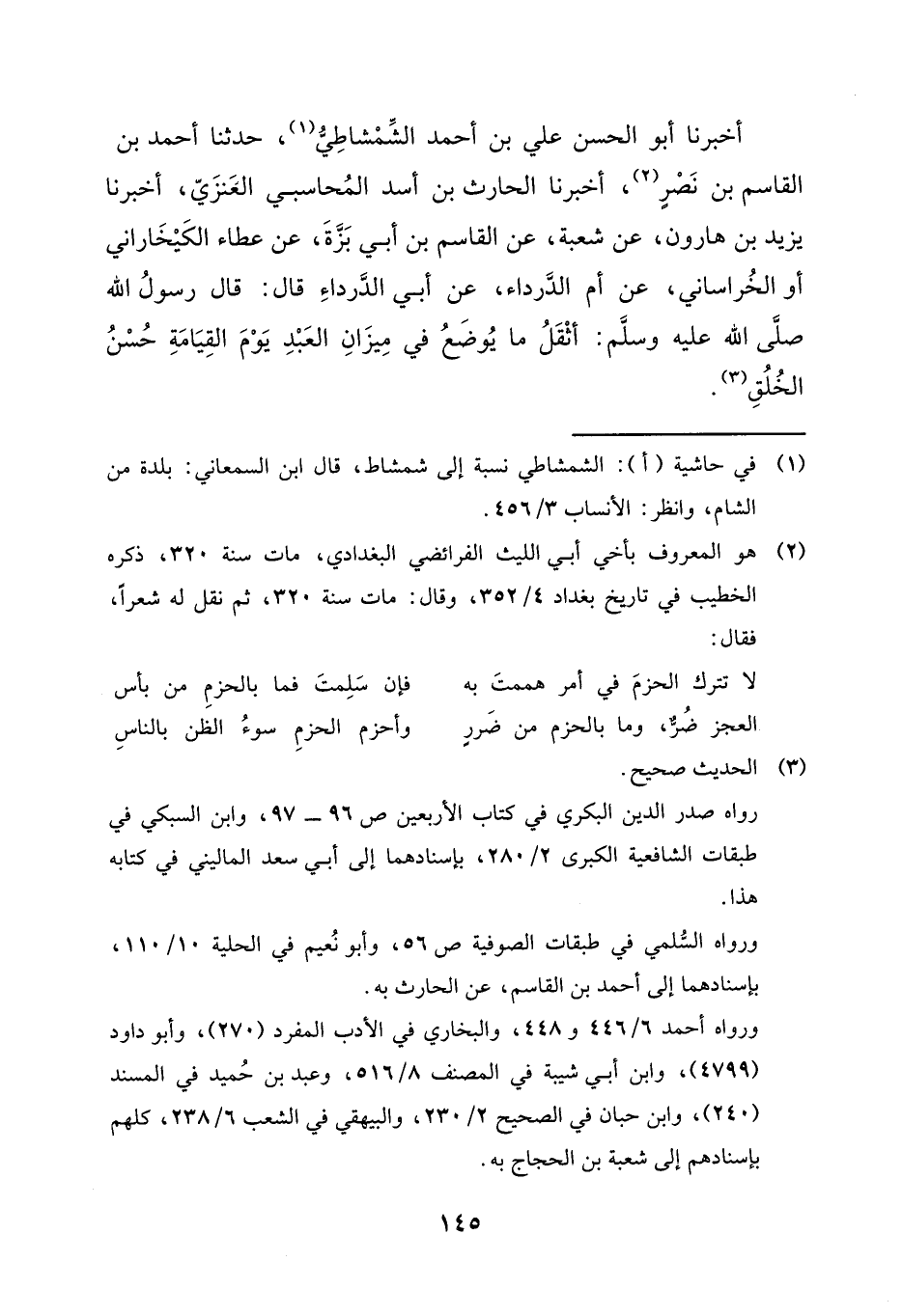 أَخْبَرَنَا أَبُو الْحَسَنِ عَلِيُّ بْنُ أَحْمَدَ الشَّمْشَاطِيُّ، حَدَّثَنَا أَحْمَدُ بْنُ الْقَاسِمِ بْنِ نَصْرٍ، أَخْبَرَنَا الْحَارِثُ بْنُ أَسَدٍ الْمُحَاسِبِيُّ الْعَنَزِيُّ، أَخْبَرَنَا يَزِيدُ بْنُ هَارُونَ، عَنْ شُعْبَةَ، عَنِ الْقَاسِمِ بْنِ أَبِي بَزَّةَ، عَنْ عَطَاءٍ الْكَيْخَارَانِيِّ أَوِ الْخُرَاسَانِيِّ، عَنْ أُمِّ الدَّرْدَاءِ، عَنْ أَبِي الدَّرْدَاءِ، قَالَ: قَالَ رَسُولُ اللَّهِ صَلَّى اللَّهُ عَلَيْهِ وَسَلَّمَ: §«أَثْقَلُ مَا يُوضَعُ فِي مِيزَانِ الْعَبْدِ يَوْمَ الْقِيَامَةِ حُسْنُ الْخُلُقِ»
