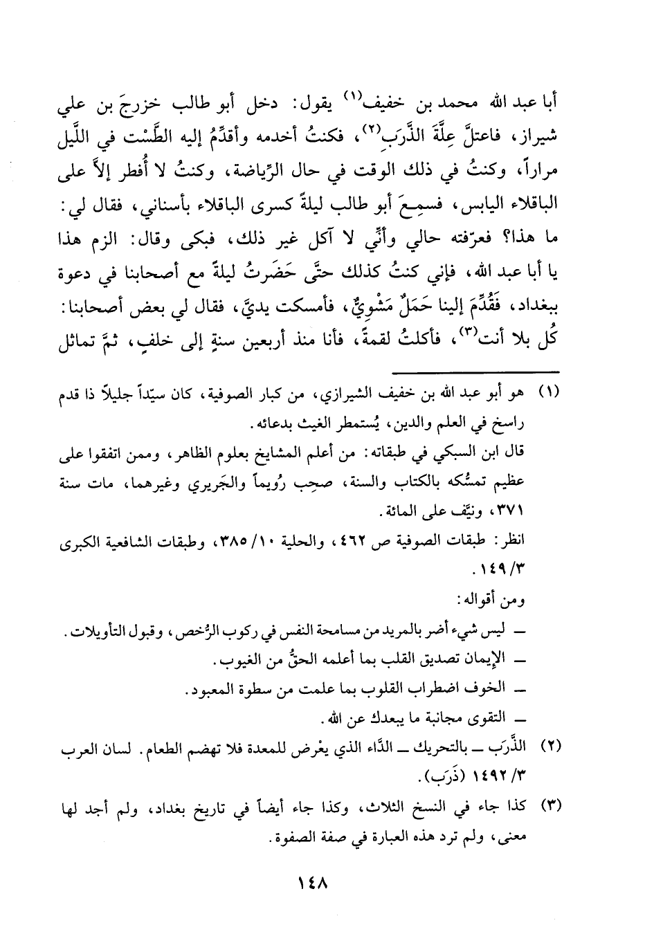 أَبَا عَبْدِ اللَّهِ مُحَمَّدَ بْنَ خَفِيفٍ يَقُولُ: دَخَلَ أَبُو طَالِبٍ خَزْرَجُ بْنُ عَلِيٍّ شِيرَازَ، فَاعْتَلَّ عِلَّةَ الذَّرَبِ، فَكُنْتُ أَخْدُمُهُ وَأُقَدِّمُ إِلَيْهِ الطَّسْتَ فِي اللَّيْلِ مِرَارًا، وَكُنْتُ فِي ذَلِكَ الْوَقْتِ فِي حَالِ الرِّيَاضَةِ، وَكُنْتُ لَا أُفْطِرُ إِلَّا عَلَى الْبَاقِلَّاءِ الْيَابِسِ، فَسَمِعَ أَبُوَ طَالِبٍ لَيْلَةً كَسْرِيَ الْبَاقِلَّاءَ بِأَسْنَانِي، فَقَالَ لِي: مَا هَذَا؟ فَعَرَّفْتُهُ حَالِي وَأَنِّي لَا آكُلُ غَيْرَ ذَلِكَ، فَبَكَى وَقَالَ: الْزَمْ هَذَا يَا أَبَا عَبْدِ اللَّهِ، فَإِنِّي كُنْتُ كَذَلِكَ حَتَّى حَضَرْتُ لَيْلَةً مَعَ أَصْحَابِنَا فِي دَعْوَةٍ بِبَغْدَادَ، فَقُدِّمَ إِلَيْنَا حَمَلٌ مَشْوِيُّ، فَأَمْسَكْتُ يَدِي، فَقَالَ لِي بَعْضُ أَصْحَابِنَا: كُلْ بِلَا أَنْتَ، " §فَأَكَلْتُ لُقْمَةً، فَأَنَا مُنْذُ أَرْبَعِينَ سَنَةً إِلَى خَلْفٍ، ثُمَّ تَمَاثَلَ -[149]- وَخَرَجَ إِلَى بَعْضِ النَّوَاحِي، وَجَلَسَ فِي رِبَاطٍ وَسَوَّدَ دَاخِلَ الرِّبَاطِ وَخَارِجَهُ، وَقَالَ: هَكَذَا جُلُوسُ أَهْلِ الْمَصَائِبِ، فَمَا خَرَجَ مِنْهُ حَتَّى مَاتَ "