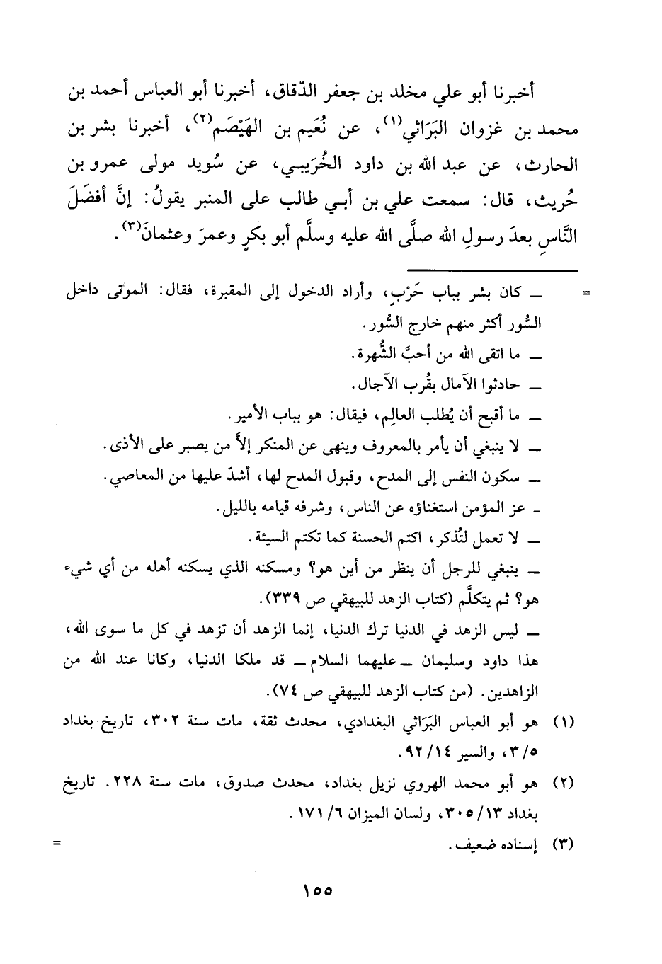 أَخْبَرَنَا أَبُو عَلِيٍّ مَخْلَدُ بْنِ جَعْفَرٍ الدَّقَّاقُ، أَخْبَرَنَا أَبُو الْعَبَّاسِ أَحْمَدُ بْنُ مُحَمَّدِ بْنِ غَزْوَانَ الْبَرَاثِيُّ، عَنْ نُعَيْمِ بْنِ الْهَيْصَمِ، أَخْبَرَنَا بِشْرُ بْنُ الْحَارِثِ، عَنْ عَبْدِ اللَّهِ بْنِ دَاوُدَ الْخُرَيْبِيِّ، عَنْ سُوَيْدٍ، مَوْلَى عَمْرِو بْنِ حُرَيْثٍ، قَالَ: سَمِعْتُ عَلِيَّ بْنَ أَبِي طَالِبٍ، عَلَى الْمِنْبَرِ يَقُولُ: إِنَّ §«أَفْضَلَ النَّاسِ بَعْدَ رَسُولِ اللَّهِ صَلَّى اللَّهُ عَلَيْهِ وَسَلَّمَ أَبُو بَكْرٍ وَعُمَرُ وَعُثْمَانُ»