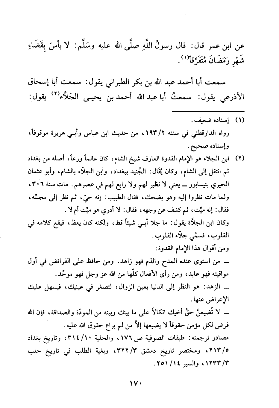 سَمِعْتُ أَبَا أَحْمَدَ عَبْدَ اللَّهِ بْنِ بَكْرٍ الطَّبَرَانِيَّ، يَقُولُ: سَمِعْتُ أَبَا إِسْحَاقَ الْأَذْرَعِيَّ، يَقُولُ: سَمِعْتُ أَبَا عَبْدِ اللَّهِ أَحْمَدَ بْنَ يَحْيَى الْجَلَّاءَ يَقُولُ: -[171]- قَدِمْتُ عَلَى أَبِي عُبَيْدٍ الْبُسْرِيِّ فَأَخْلَى لِي بَيْتًا، فَكَانَ يَأْتِينِي بَعْدَ صَلَاةِ الْعِشَاءِ الْآخِرَةِ، فَيَقِفُ عَلَى الْبَابِ فَيَقُولُ: " §مَا أَظُنُّ أَنَّ أَبَا عَبْدِ اللَّهِ يَعْدِلُ بِالْوَحْدَةِ شَيْئًا، فَأَقُولُ: إِلَّا مِنْكَ، فَيَقُولُ: إِلَّا مِنِّي؟، فَأَقُولُ: نَعَمْ، فَيَدْخُلُ فَيُذَاكِرُنِي إِلَى أَنْ يُؤَذَّنَ لِصَلَاةِ الْفَجْرِ، فَيَخْرُجُ وَيُصَلِّي "