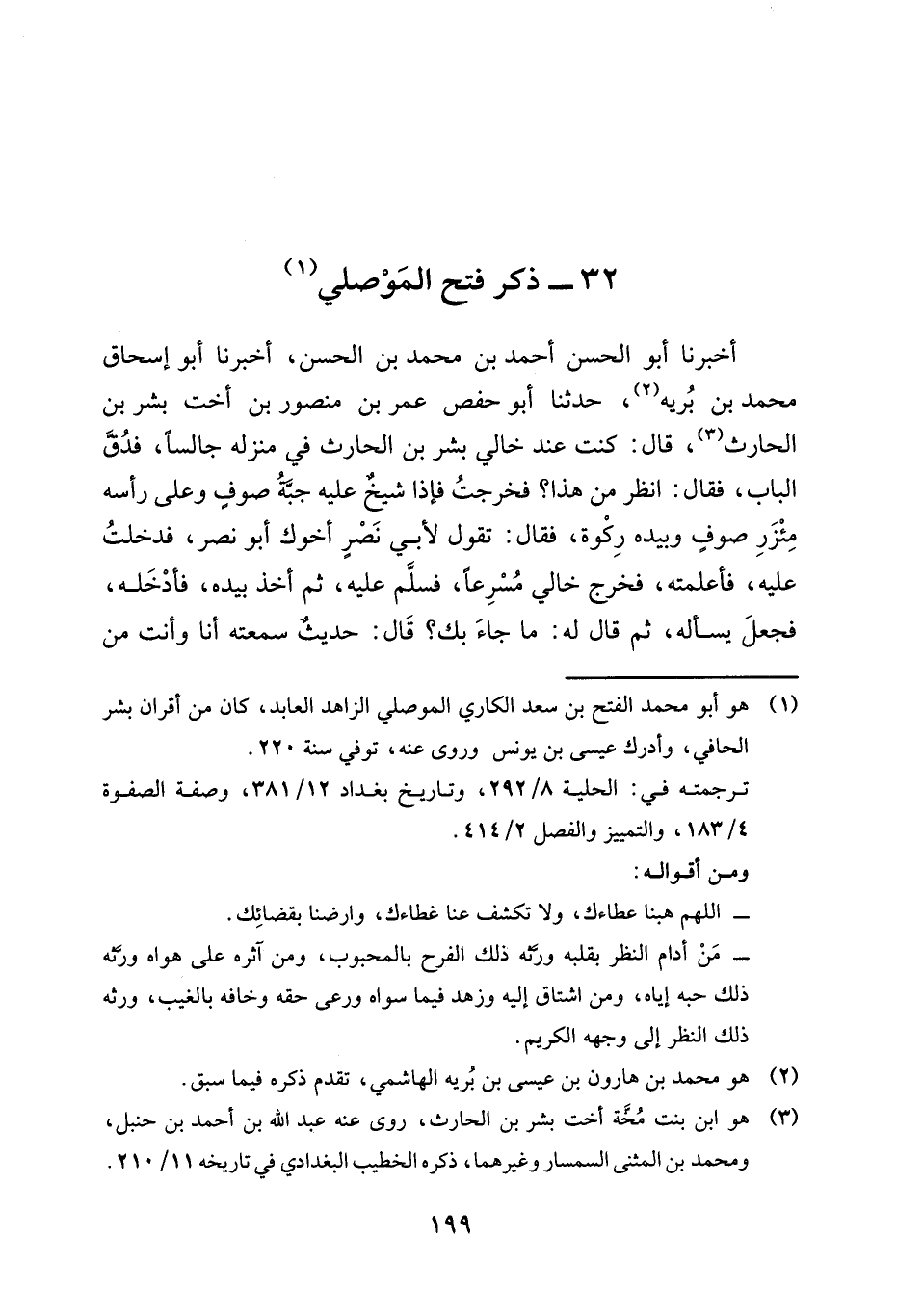 أَخْبَرَنَا أَبُو الْحَسَنِ أَحْمَدُ بْنُ مُحَمَّدِ بْنِ الْحَسَنِ، أَخْبَرَنَا أَبُو إِسْحَاقَ مُحَمَّدُ بْنُ بُرَيْهٍ، حَدَّثَنَا أَبُو حَفْصٍ عُمَرُ بْنُ مَنْصُورِ ابْنِ أُخْتِ بِشْرِ بْنِ الْحَارِثِ، قَالَ: كُنْتُ عِنْدَ خَالِي بِشْرِ بْنِ الْحَارِثِ فِي مَنْزِلِهِ جَالِسًا، فَدَقَّ الْبَابُ، فَقَالَ: انْظُرْ مَنْ هَذَا؟ فَخَرَجْتُ فَإِذَا شَيْخٌ عَلَيْهِ جُبَّةُ صُوفٍ وَعَلَى رَأْسِهِ مِئْزَرُ صُوفٍ، وَبِيَدِهِ رَكْوَةٌ، فَقَالَ: تَقُولُ لِأَبِي نَصْرٍ أَخُوكَ أَبُو نَصْرٍ، فَدَخَلْتُ عَلَيْهِ، فَأَعْلَمْتُهُ، فَخَرَجَ خَالِي مُسْرِعًا، فَسَلَّمَ عَلَيْهِ، ثُمَّ أَخَذَ بِيَدِهِ، فَأَدْخَلَهُ، فَجَعَلَ يَسْأَلُهُ، ثُمَّ قَالَ لَهُ: مَا جَاءَ بِكَ؟ قَالَ: حَدِيثٌ سَمِعْتُهُ أَنَا وَأَنْتُ مِنْ -[200]- عِيسَى بْنِ يُونُسَ فِي الْغُسْلِ قَدْ شَكَكْتُ فِيهِ، فَقَامَ خَالِي فَأَخْرَجَ قِمَطْرًا فَفَتَّشَهَا، ثُمَّ أَخْرَجَ دِفْتَرًا مِنْ قَرَاطِيسَ فَقَرَأَ مِنْهُ، فَقَالَ: حَدَّثَنَا عِيسَى بْنُ يُونُسَ، أَخْبَرَنَا أَشْعَثُ بْنُ عَبْدِ الْمَلِكِ، عَنْ مُحَمَّدِ بْنِ سِيرِينَ، عَنْ أَبِي هُرَيْرَةَ، قَالَ: قَالَ رَسُولُ اللَّهِ صَلَّى اللَّهُ عَلَيْهِ وَسَلَّمَ: «§إِذَا قَعَدَ بَيْنَ شُعَبِهَا الْأَرْبَعِ وَاجْتَهَدَ فَقَدْ وَجَبَ الْغُسْلُ» فَقَالَ لَهُ الشَّيْخُ: اسْمَعْهُ مِنِّي لَا أَكُونُ أَغْلَطُ فِيهِ، فَقَالَ لَهُ خَالِي: هَاتِهِ وَجَعَلَ خَالِي يَنْظُرُ فِي الدِّفْتَرِ، فَقَالَ لَهُ الشَّيْخُ: حَدَّثَنَا عِيسَى بْنُ يُونُسَ، أَخْبَرَنَا أَشْعَثُ بْنُ عَبْدِ الْمَلِكِ، عَنْ مُحَمَّدِ بْنِ سِيرِينَ، عَنْ أَبِي هُرَيْرَةَ قَالَ: قَالَ رَسُولُ اللَّهِ صَلَّى اللَّهُ عَلَيْهِ وَسَلَّمَ: «إِذَا قَعَدَ بَيْنَ شُعَبِهَا الْأَرْبَعِ وَاجْتَهَدَ، فَقَدْ وَجَبَ الْغُسْلُ» فَقَالِ الرَّجُلُ: قَدْ حَفِظْتُهُ، ثُمَّ أَخْرَجَ خَالِي مِنْ كُمِّهِ قِطْعَةً، فَقَالَ لِي: هَذِهِ نِصْفُ دِرْهَمٍ اشْتَرِ بِدَانِقَيْنِ خُبْزًا وَبِدَانِقٍ تَمْرًا، فَمَضَيْتُ وَاشْتَرَيْتُ، ثُمَّ جِئْتُ بِهِ إِلَيْهِ، فَوَضَعَهُ بَيْنَ يَدَيِ الشَّيْخِ، فَأَكَلَ الشَّيْخُ وَخَالِي وَأَكَلْتُ مَعَهُمَا، ثُمَّ قَالَ الشَّيْخُ لِخَالِي: تَأْمُرُ بِشَيْءٍ، فَسَلَّمَ خَالِي عَلَيْهِ وَخَرَجَ مَعَهُ إِلَى بَابِ الدَّارِ، فَلَمَّا -[201]- مَضَى الشَّيْخُ قُلْتُ لِخَالِي: مَنْ هَذَا الشَّيْخُ؟ فَقَالَ: أَوَلَا تَعْرِفُهُ؟ هَذَا فَتْحٌ الْمَوْصِلِيُّ، الْحَقْهُ فَاسْأَلْهُ أَنْ يَدْعُوَ لَكَ