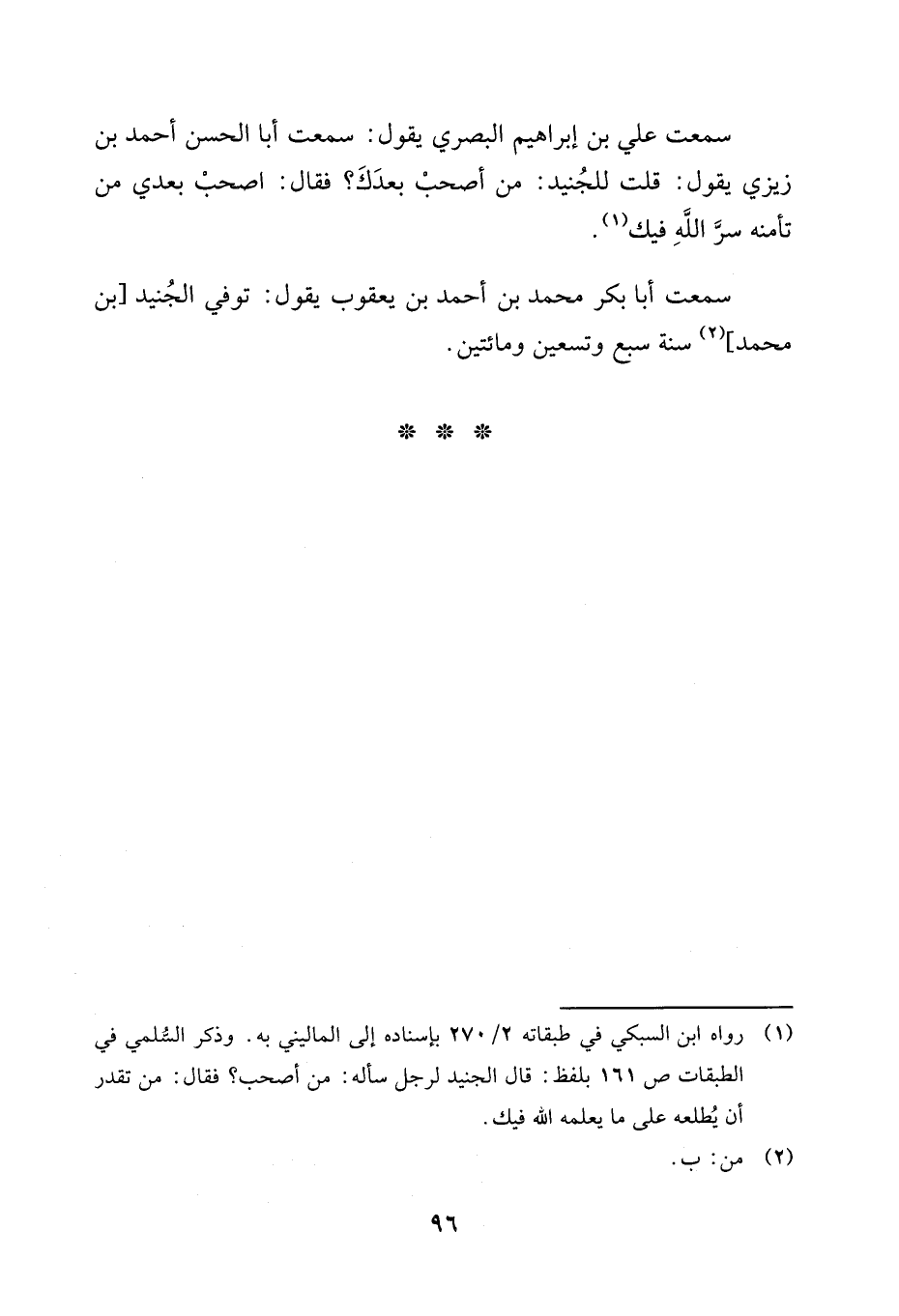 سَمِعْتُ عَلِيَّ بْنَ إِبْرَاهِيمَ الْبَصْرِيَّ، يَقُولُ: سَمِعْتُ أَبَا الْحَسَنِ أَحْمَدَ بْنَ زِيزِيٍّ، يَقُولُ: قُلْتُ لِلْجُنَيْدِ: مَنْ أَصْحَبُ بَعْدَكَ؟ فَقَالَ: §«اصْحَبْ بَعْدِي مَنْ تَأْمَنُهُ سِرَّ اللَّهِ فِيكَ» سَمِعْتُ أَبَا بَكْرٍ مُحَمَّدَ بْنَ أَحْمَدَ بْنَ يَعْقُوبَ يَقُولُ: تُوُفِّيَ الْجُنَيْدُ بْنُ مُحَمَّدٍ سَنَةَ سَبْعٍ وَتِسْعِينَ وَمِائَتَيْنِ "