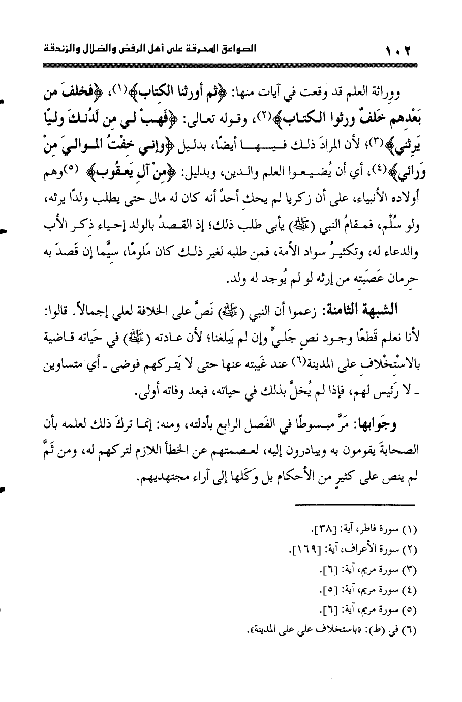 ووراثة الْعلم قد وَقعت فِي آيَات مِنْهَا {ثمَّ أَوْرَثنَا الْكتاب} {فخلف من بعدهمْ خلف ورثوا الْكتاب} وَقَوله تَعَالَى {فَهَب لي من لَدُنْك وليا يَرِثنِي} لِأَن المُرَاد ذَلِك فِيهَا أَيْضا بِدَلِيل وَإِنِّي خفت الموَالِي من ورائي أَي أَن يضيعوا الْعلم وَالدّين وبدليل {من آل يَعْقُوب} وهم أَوْلَاده الْأَنْبِيَاء على أَن زَكَرِيَّا لم يحك أحد أَنه كَانَ لَهُ مَال حَتَّى يطْلب ولدا يَرِثهُ وَلَو سلم فمقام النَّبِي صلى الله عَلَيْهِ وَسلم يَأْبَى طلب ذَلِك إِذْ الْقَصْد بِالْوَلَدِ إحْيَاء ذكر الْأَب وَالدُّعَاء لَهُ وتكثير سَواد الْأمة فَمن طلبه لغير ذَلِك كَانَ ملوما سِيمَا إِن قصد بِهِ حرمَان عصبته من إِرْثه لَو لم يُوجد لَهُ ولد
