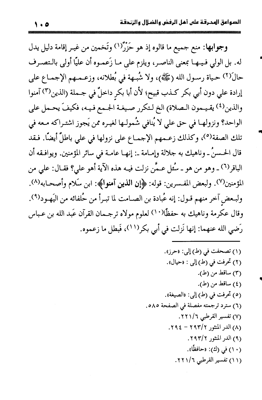 وجوابها منع جَمِيع مَا قَالُوهُ إِذْ هُوَ حزر وتخمين من غير إِقَامَة دَلِيل يدل لَهُ بل الْوَلِيّ فِيهَا بِمَعْنى النَّاصِر وَيلْزم على مَا زعموه أَن عليا أولى بِالتَّصَرُّفِ حَال حَيَاة رَسُول الله صلى الله عَلَيْهِ وَسلم وَلَا شُبْهَة فِي بُطْلَانه وزعمهم الْإِجْمَاع على إِرَادَة عَليّ دون أبي بكر كذب قَبِيح لِأَن أَبَا بكر دَاخل فِي جملَة الَّذين آمنُوا وَالَّذين يُقِيمُونَ الصَّلَاة الخ لتكرر صِيغَة الْجمع فِيهِ فَكيف يحمل على الْوَاحِد ونزولها فِي حق عَليّ لَا يُنَافِي شمولها لغيره مِمَّن يجوز اشتراكه مَعَه فِي تِلْكَ الصّفة وَكَذَلِكَ زعمهم الْإِجْمَاع على نُزُولهَا فِي عَليّ بَاطِل أَيْضا فقد قَالَ الْحسن وناهيك بِهِ جلالة وإمامة إِنَّهَا عَامَّة فِي سَائِر الْمُؤمنِينَ وَيُوَافِقهُ أَن الباقر وَهُوَ من هُوَ سُئِلَ عَمَّن نزلت فِيهِ هَذِه الْآيَة أهوَ عَليّ فَقَالَ عَليّ من الْمُؤمنِينَ ولبعض الْمُفَسّرين قَوْله {إِن الَّذين آمنُوا} ابْن سَلام وَأَصْحَابه ولبعض آخر مِنْهُم قَول إِنَّه عبَادَة بن الصَّامِت لما تَبرأ من حلفائه من الْيَهُود وَقَالَ عِكْرِمَة وناهيك بِهِ حفظا لعلوم مَوْلَاهُ ترجمان الْقُرْآن عبد الله بن عَبَّاس رَضِي الله عَنْهُمَا إِنَّهَا نزلت فِي أبي بكر فَبَطل مَا زعموه