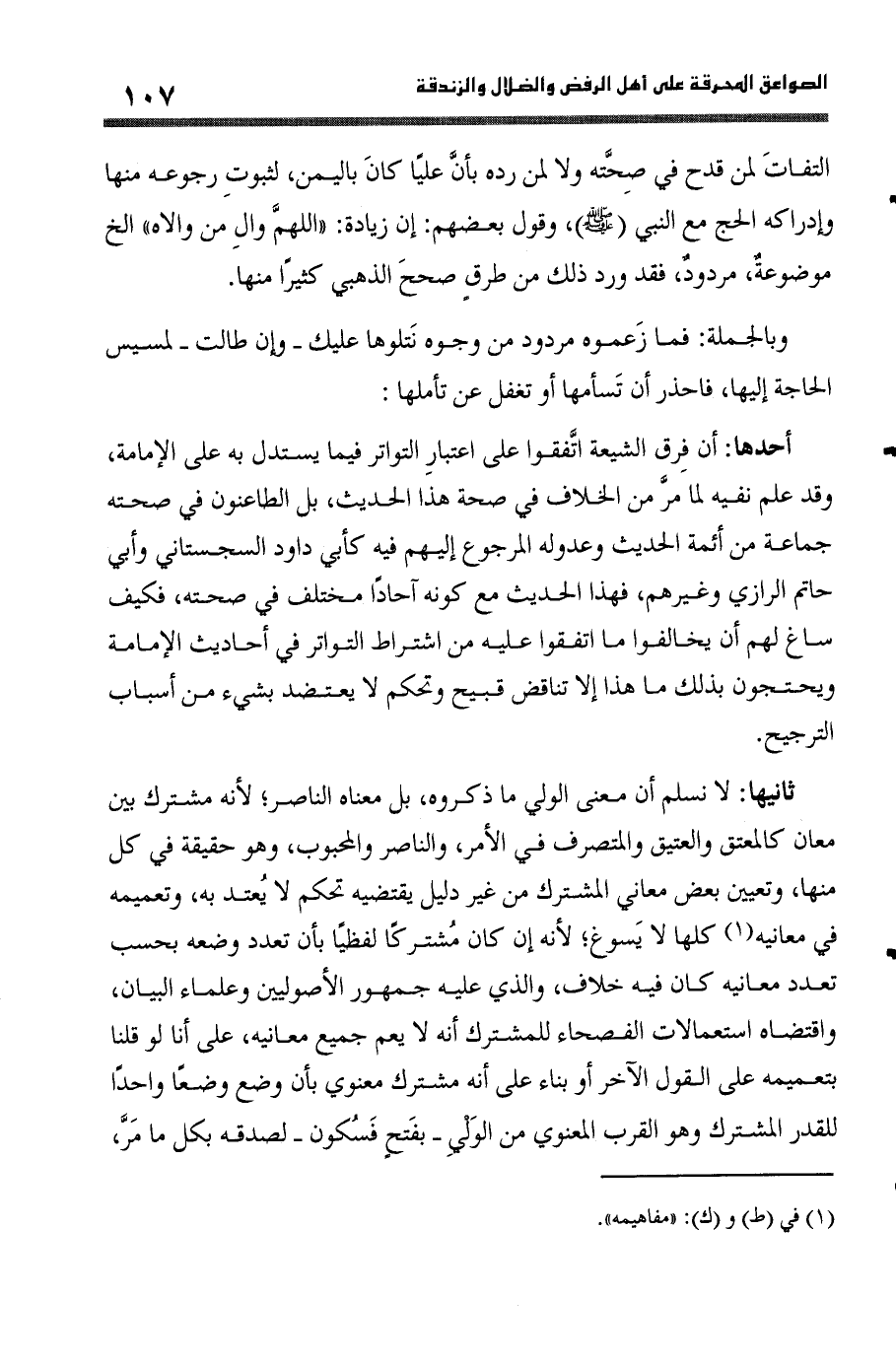 أَحدهَا أَن فرق الشِّيعَة اتَّفقُوا على اعْتِبَار التَّوَاتُر فِيمَا يسْتَدلّ بِهِ على الْإِمَامَة وَقد علم نَفْيه لما مر من الْخلاف فِي صِحَة هَذَا الحَدِيث بل الطاعنون فِي صِحَّته جمَاعَة من أَئِمَّة الحَدِيث وعدوله المرجوع إِلَيْهِم فِيهِ كَأبي دَاوُد السجسْتانِي وَأبي حَاتِم الرَّازِيّ وَغَيرهم فَهَذَا الحَدِيث مَعَ كَونه آحادا مُخْتَلف فِي صِحَّته فَكيف سَاغَ لَهُم أَن يخالفوا مَا اتَّفقُوا عَلَيْهِ من اشْتِرَاط التَّوَاتُر فِي أَحَادِيث الْإِمَامَة ويحتجون بذلك مَا هَذَا إِلَّا تنَاقض قَبِيح وتحكم لَا يعتضد بِشَيْء من أَسبَاب التَّرْجِيح