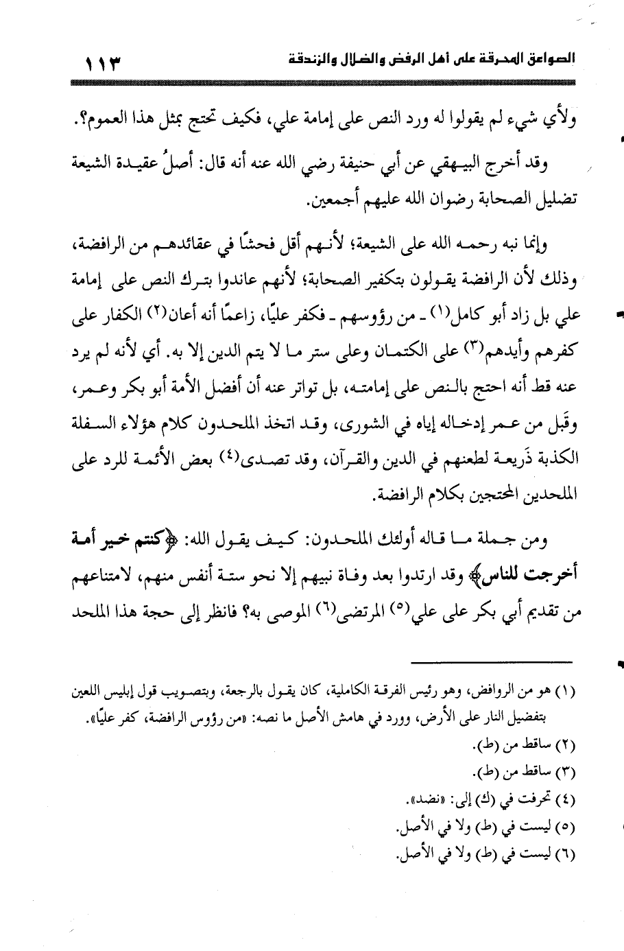 وَمن جملَة مَا قَالَه أُولَئِكَ الْمُلْحِدُونَ كَيفَ يَقُول الله {كُنْتُم خير أمة أخرجت للنَّاس} وَقد ارْتَدُّوا بعد وَفَاة نَبِيّهم إِلَّا نَحْو سِتَّة أنفس مِنْهُم لامتناعهم من تَقْدِيم أبي بكر على عَليّ المرتضى الْمُوصى بِهِ فَانْظُر إِلَى حجَّة هَذَا الملحد