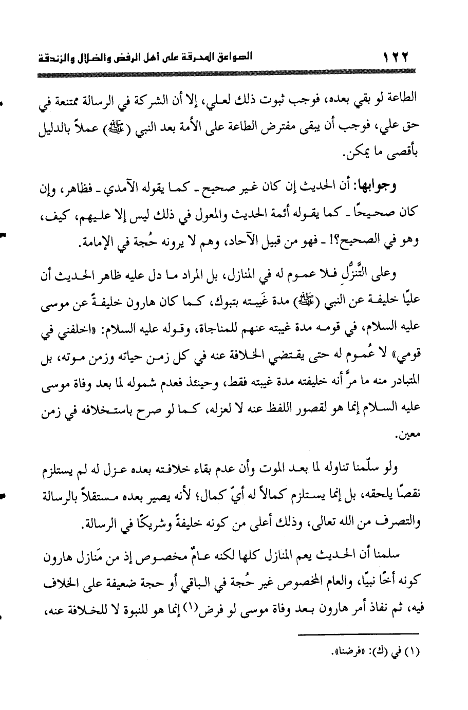 سلمنَا أَن الحَدِيث يعم الْمنَازل كلهَا لكنه عَام مَخْصُوص إِذْ من منَازِل هَارُون كَونه أَخا نَبيا وَالْعَام الْمَخْصُوص غير حجَّة فِي الْبَاقِي أَو حجَّة ضَعِيفَة على الْخلاف فِيهِ ثمَّ نَفاذ أَمر هَارُون بعد وَفَاة مُوسَى لَو فرض إِنَّمَا هُوَ للنبوة لَا للخلافة عَنهُ