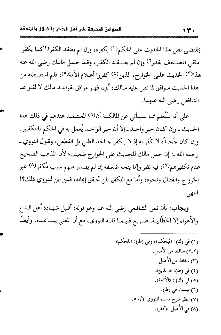 على أَنه سَيعْلَمُ مِمَّا سَيَأْتِي عَن الْمَالِكِيَّة أَن الْمُعْتَمد عِنْدهم فِي ذَلِك هَذَا الحَدِيث وَإِن كَانَ خبر وَاحِد إِلَّا أَن خبر الْوَاحِد يعْمل بِهِ فِي الحكم بالتكفير وَإِن كَانَ جَحده لَا كفر بِهِ إِذْ لَا يكفر جَاحد الظني بل الْقطعِي وَقَول النَّوَوِيّ رَحمَه الله إِن حمل مَالك للْحَدِيث على الْخَوَارِج ضَعِيف لِأَن الْمَذْهَب الصَّحِيح عدم تكفيرهم فِيهِ نظر وَإِنَّمَا يتَّجه ضعفه إِن لم يصدر مِنْهُم سَبَب مكفر غير الْخُرُوج والقتال وَنَحْوه وَأما مَعَ التَّكْفِير لمن تحقق إيمَانه فَمن أَيْن للنووي ذَلِك انْتهى