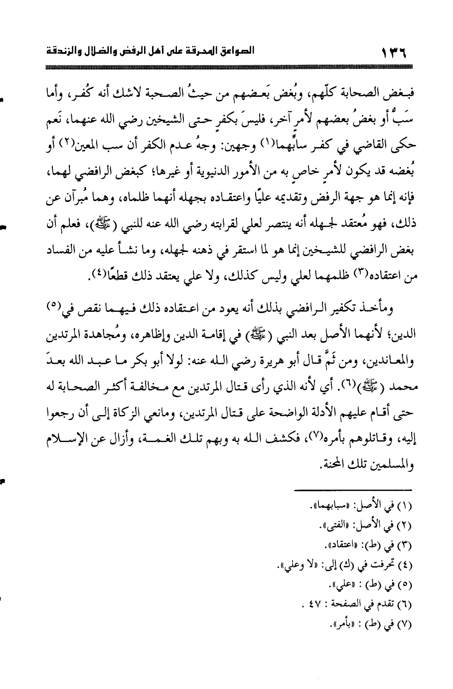 ومأخذ تَكْفِير الرافضي بذلك أَنه يعود من اعْتِقَاده ذَلِك فيهمَا نقص فِي الدّين لِأَنَّهُمَا الأَصْل بعد النَّبِي صلى الله عَلَيْهِ وَسلم فِي إِقَامَة الدّين وإظاهره ومجاهدة الْمُرْتَدين والمعاندين وَمن ثمَّ قَالَ أَبُو هُرَيْرَة رَضِي الله عَنهُ لَوْلَا أَبُو بكر مَا عبد الله بعد مُحَمَّد صلى الله عَلَيْهِ وَسلم أَي لِأَنَّهُ الَّذِي رأى قتال الْمُرْتَدين مَعَ مُخَالفَة أَكثر الصَّحَابَة لَهُ حَتَّى أَقَامَ عَلَيْهِم الْأَدِلَّة الْوَاضِحَة على قتال الْمُرْتَدين ومانعي الزَّكَاة إِلَى أَن رجعُوا إِلَيْهِ وقاتلوهم بأَمْره فكشف الله بِهِ وبهم تِلْكَ الْغُمَّة وأزال عَن الْإِسْلَام وَالْمُسْلِمين تِلْكَ المحنة