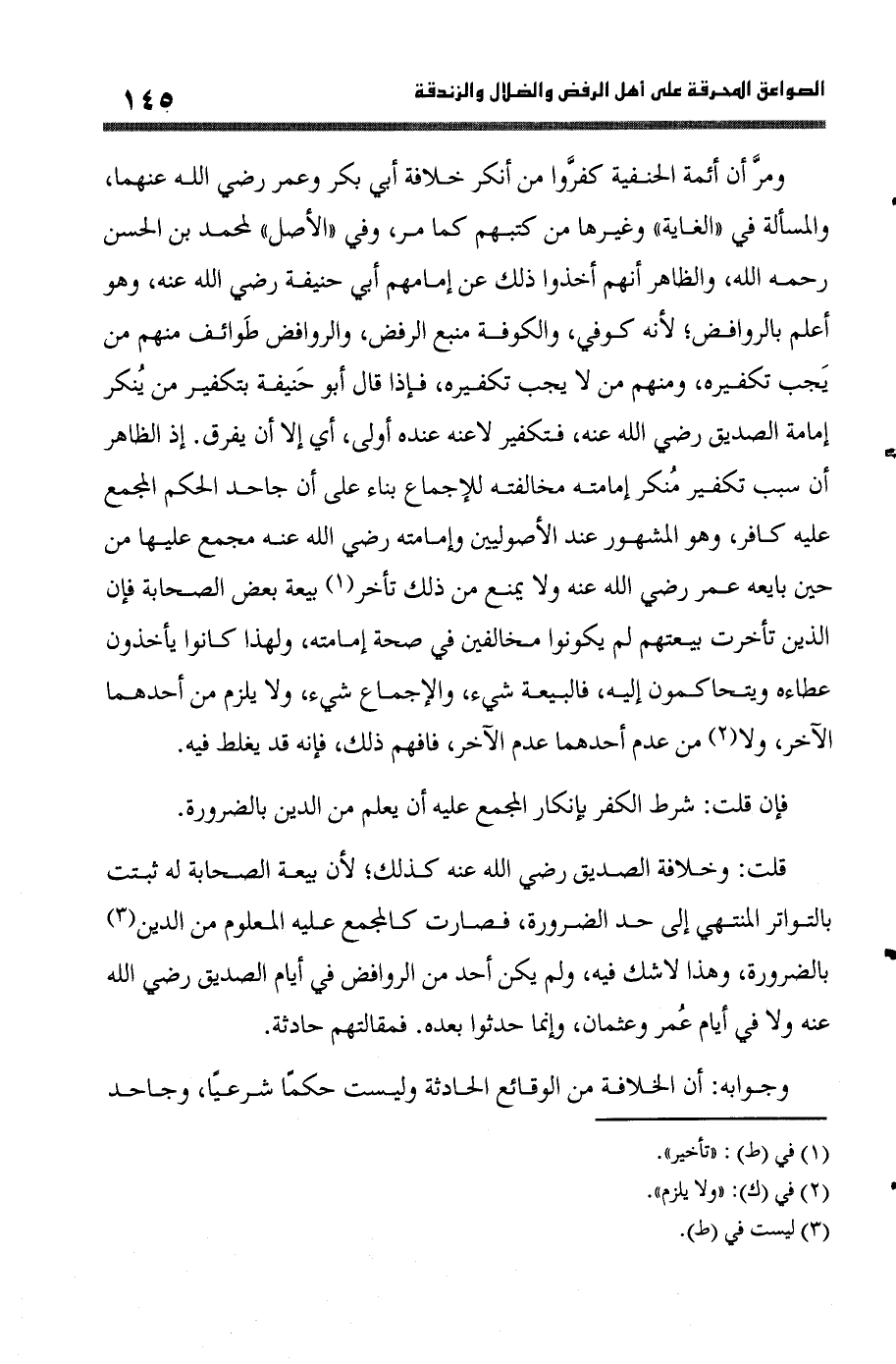 فَإِن قلت شَرط الْكفْر بإنكار الْمجمع عَلَيْهِ أَن يعلم من الدّين بِالضَّرُورَةِ قلت وَخِلَافَة الصّديق رَضِي الله عَنهُ كَذَلِك لِأَن بيعَة الصَّحَابَة لَهُ ثبتَتْ بالتواتر المنتهي إِلَى حد الضَّرُورَة فَصَارَت كالمجمع عَلَيْهِ الْمَعْلُوم من الدّين بِالضَّرُورَةِ وَهَذَا لَا شكّ فِيهِ وَلم يكن أحد من الروافض فِي أَيَّام الصّديق رَضِي الله عَنهُ وَلَا فِي أَيَّام عمر وَعُثْمَان وَإِنَّمَا حدثوا بعده فمقالتهم حَادِثَة