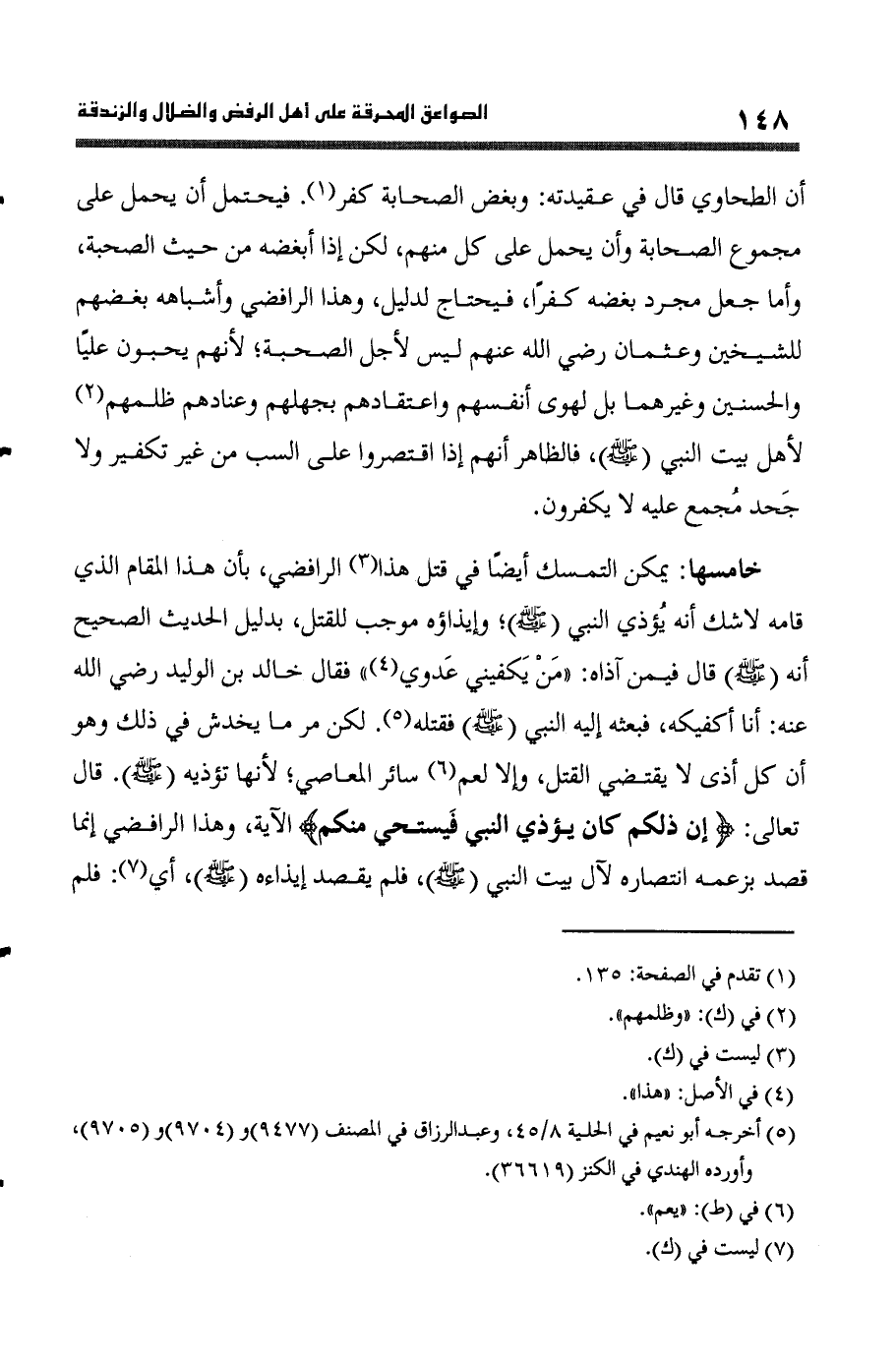 أَن الطَّحَاوِيّ قَالَ فِي عقيدته وبغض الصَّحَابَة كفر فَيحْتَمل أَن يحمل على مَجْمُوع الصَّحَابَة وان يحمل على كل مِنْهُم لَكِن إِذا بغضه من حَيْثُ الصُّحْبَة وَأما جعل مُجَرّد بغضه كفرا فَيحْتَاج لدَلِيل وَهَذَا الرافضي وأشباهه بغضهم لِلشَّيْخَيْنِ وَعُثْمَان رَضِي الله عَنْهُم لَيْسَ لأجل الصُّحْبَة لأَنهم يحبونَ عليا والحسنين وَغَيرهمَا بل لهوى أنفسهم واعتقادهم بجهلهم وعنادهم ظلمهم لأهل بَيت النَّبِي صلى الله عَلَيْهِ وَسلم فَالظَّاهِر أَنهم إِذا اقتصروا على السب من غير تَكْفِير وَلَا جحد مجمع عَلَيْهِ لَا يكفرون