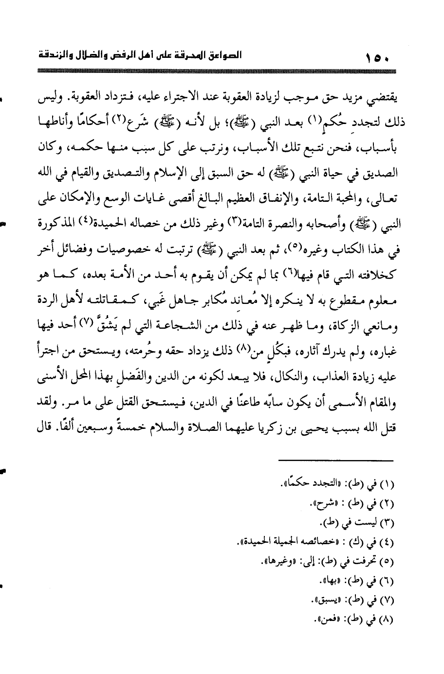 يَقْتَضِي مزِيد حق مُوجب لزِيَادَة الْعقُوبَة عِنْد الاجتراء عَلَيْهِ فتزداد الْعقُوبَة وَلَيْسَ ذَلِك لتجدد حكم بعد النَّبِي صلى الله عَلَيْهِ وَسلم بل لِأَنَّهُ صلى الله عَلَيْهِ وَسلم شرع أحكاما وأناطها بِأَسْبَاب فَنحْن نتبع تِلْكَ الْأَسْبَاب ونرتب على كل سَبَب مِنْهَا حكمه وَكَانَ الصّديق فِي حَيَاة النَّبِي صلى الله عَلَيْهِ وَسلم لَهُ حق السَّبق إِلَى الْإِسْلَام والتصديق وَالْقِيَام فِي الله تَعَالَى والمحبة التَّامَّة والإنفاق الْعَظِيم الْبَالِغ أقْصَى غايات الوسع والإمكان على النَّبِي صلى الله عَلَيْهِ وَسلم وَأَصْحَابه والنصرة التَّامَّة وَغير ذَلِك من خصاله الحميدة الْمَذْكُورَة فِي هَذَا الْكتاب وَغَيره ثمَّ بعد النَّبِي صلى الله عَلَيْهِ وَسلم ترتبت لَهُ خصوصيات وفضائل أخر كخلافته الَّتِي قَامَ فِيهَا بِمَا لم يُمكن أَن يقوم بِهِ أحد من الْأمة بعده كَمَا هُوَ مَعْلُوم مَقْطُوع بِهِ لَا يُنكره إِلَّا معاند مكابر جَاهِل غبي كمقاتلته لأهل الرِّدَّة ومانعي الزَّكَاة وَمَا ظهر عَنهُ فِي ذَلِك من الشجَاعَة الَّتِي لم يشق أحد فِيهَا غباره وَلم يدْرك آثاره فبكل من ذَلِك يزْدَاد حَقه وحرمته وَيسْتَحق من اجترأ عَلَيْهِ زِيَادَة الْعَذَاب والنكال فَلَا يبعد لكَونه من الدّين وَالْفضل بِهَذَا الْمحل الْأَسْنَى وَالْمقَام الأسمى أَن يكون سابه طاعنا فِي الدّين فَيسْتَحق الْقَتْل على مَا مر وَلَقَد قتل الله بِسَبَب يحيى بن زَكَرِيَّا عَلَيْهِمَا الصَّلَاة وَالسَّلَام خَمْسَة وَسبعين ألفا قَالَ