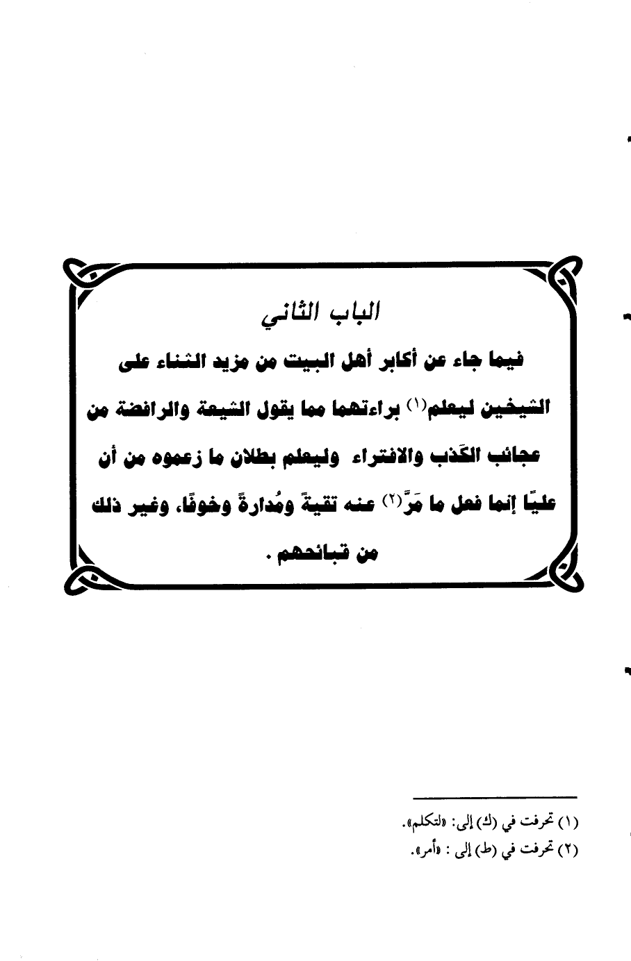 الْبَاب الثَّانِي فِيمَا جَاءَ عَن أكَابِر أهل الْبَيْت من مزِيد الثَّنَاء على الشَّيْخَيْنِ ليعلم براءتهما مِمَّا يَقُول الشِّيعَة والرافضة من عجائب الْكَذِب والافتراء وليعلم بطلَان مَا زعموه من أَن عليا إِنَّمَا فعل مَا مر عَنهُ تقية ومدارة وخوفا وَغير ذَلِك من قبائحهم