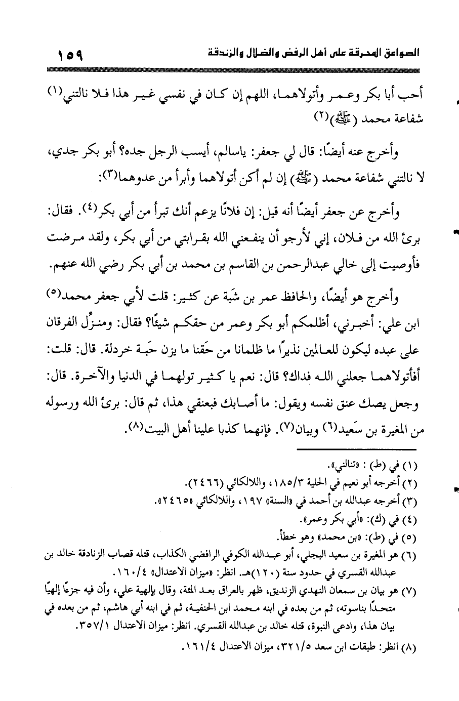 وَأخرج هُوَ أَيْضا والحافظ عمر بن شبة عَن كثير قلت لأبي جَعْفَر مُحَمَّد بن عَليّ أَخْبرنِي أظلمكم أَبُو بكر وَعمر من حقكم شَيْئا فَقَالَ ومنزل الْفرْقَان على عَبده ليَكُون للْعَالمين نذيرا مَا ظلمانا من حَقنا مَا يزن حَبَّة خردلة قَالَ قلت أفأتولاهما جعلني الله فدَاك قَالَ نعم يَا كثير تولهما فِي الدُّنْيَا وَالْآخِرَة قَالَ وَجعل يصك عنق نَفسه وَيَقُول مَا أَصَابَك فبعنقي هَذَا ثمَّ قَالَ برِئ الله وَرَسُوله من الْمُغيرَة بن سعيد وَبَيَان فَإِنَّهُمَا كذبا علينا أهل الْبَيْت