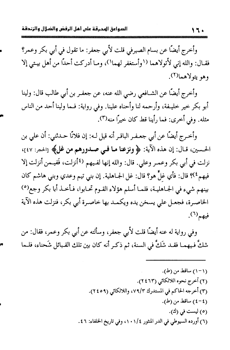 وَأخرج أَيْضا عَن أبي جَعْفَر الباقر أَنه قيل لَهُ إِن فلَانا حَدثنِي أَن عَليّ بن الْحُسَيْن قَالَ إِن هَذِه الْآيَة وَنَزَعْنَا مَا فِي صُدُورهمْ من غل الْحجر 47 نزلت فِي أبي بكر وَعمر وَعلي قَالَ وَالله إِنَّهَا لفيهم أنزلت ففيمن أنزلت إِلَّا فيهم قَالَ فَأَي غل هُوَ قَالَ غل الْجَاهِلِيَّة إِن بني تيم وعدي وَبني هَاشم كَانَ بَينهم شَيْء فِي الْجَاهِلِيَّة فَلَمَّا أسلم هَؤُلَاءِ الْقَوْم تحَابوا فَأخذ أَبَا بكر وجع الخاصرة فَجعل عَليّ يسخن يَده ويكمد بهَا خاصرة أبي بكر فَنزلت هَذِه الْآيَة فيهم