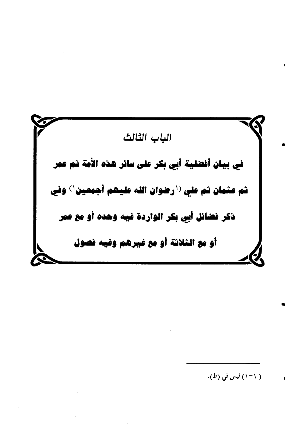 الْبَاب الثَّالِث فِي بَيَان أَفضَلِيَّة أبي بكر على سَائِر هَذِه الْأمة ثمَّ عمر ثمَّ عُثْمَان ثمَّ عَليّ رضوَان الله عَلَيْهِم أَجْمَعِينَ وَفِي ذكر فَضَائِل أبي بكر الْوَارِدَة فِيهِ وَحده أَو مَعَ عمر أَو مَعَ الثَّلَاثَة أَو مَعَ غَيرهم وَفِيه فُصُول