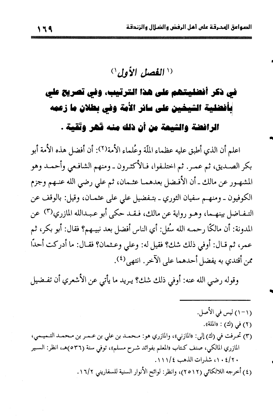 الْفَصْل الأول فِي ذكر أفضليتهم على هَذَا التَّرْتِيب وَفِي تَصْرِيح عَليّ بأفضلية الشَّيْخَيْنِ على سَائِر الْأمة وَفِي بطلَان مَا زَعمه الرافضة والشيعة من أَن ذَلِك مِنْهُ قهر وتقية