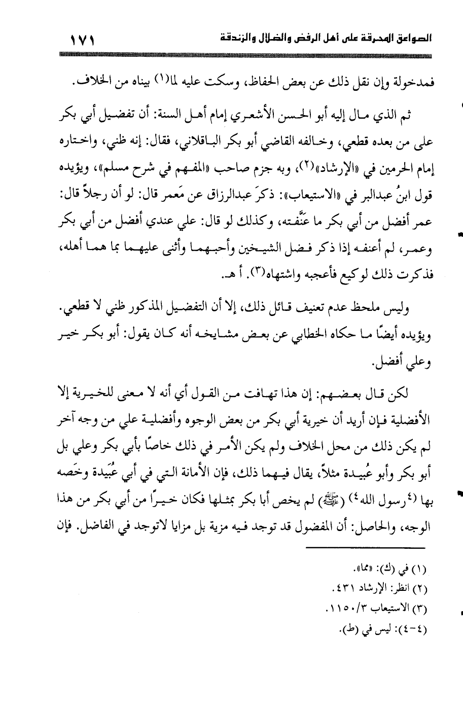 ثمَّ الَّذِي مَال إِلَيْهِ أَبُو الْحسن الْأَشْعَرِيّ إِمَام أهل السّنة أَن تَفْضِيل أبي بكر على من بعده قَطْعِيّ وَخَالفهُ القَاضِي أَبُو بكر الباقلاني فَقَالَ إِنَّه ظَنِّي وَاخْتَارَهُ إِمَام الْحَرَمَيْنِ فِي الْإِرْشَاد وَبِه جزم صَاحب الْمُفْهم فِي شرح مُسلم وَيُؤَيِّدهُ قَول ابْن عبد الْبر فِي الِاسْتِيعَاب ذكر عبد الرَّزَّاق عَن معمر قَالَ لَو أَن رجلا قَالَ عمر أفضل من أبي بكر مَا عنفته وَكَذَلِكَ لَو قَالَ عَليّ عِنْدِي أفضل من أبي بكر وَعمر لم أعنفه إِذا ذكر فضل الشَّيْخَيْنِ وأحبهما وَأثْنى عَلَيْهِمَا بِمَا هما أَهله فَذكرت ذَلِك لوكيع فأعجبه أه واشتهاه