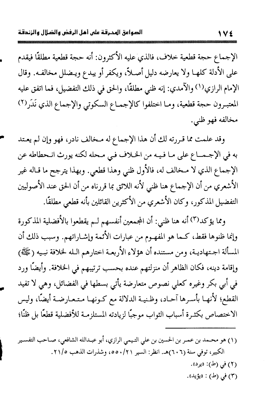 وَمِمَّا يُؤَكد أَنه هُنَا ظَنِّي أَن المجمعين أنفسهم لم يقطعوا بالأفضلية الْمَذْكُورَة وَإِنَّمَا ظنوها فَقَط كَمَا هُوَ الْمَفْهُوم من عِبَارَات الْأَئِمَّة وإشاراتهم وَسبب ذَلِك أَن الْمَسْأَلَة اجتهادية وَمن مُسْتَنده أَن هَؤُلَاءِ الْأَرْبَعَة اخْتَارَهُمْ الله لخلافة نبيه صلى الله عَلَيْهِ وَسلم وَإِقَامَة دينه فَكَانَ الظَّاهِر أَن مَنْزِلَتهمْ عِنْده بِحَسب ترتيبهم فِي الْخلَافَة وَأَيْضًا ورد فِي أبي بكر وَغَيره كعلي نُصُوص متعارضة يَأْتِي بسطها فِي الْفَضَائِل وَهِي لَا تفِيد الْقطع لِأَنَّهَا بأسرها آحَاد وظنية الدّلَالَة مَعَ كَونهَا متعارضة أَيْضا وَلَيْسَ الِاخْتِصَاص بِكَثْرَة أَسبَاب الثَّوَاب مُوجبا لزيادته المستلزمة للأفضلية قطعا بل ظنا