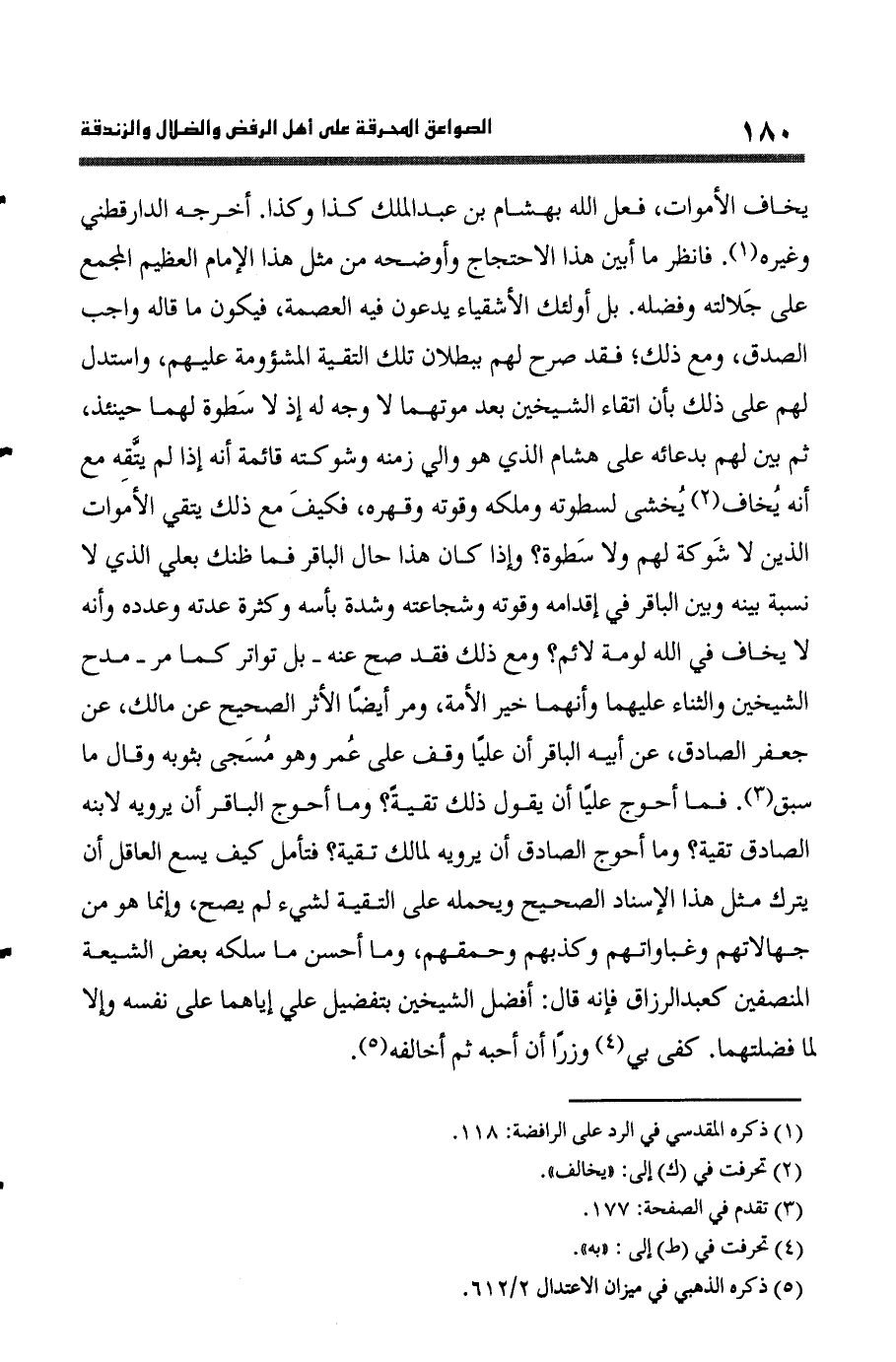 يخَاف الْأَمْوَات فعل الله بِهِشَام بن عبد الْملك كَذَا وَكَذَا أخرجه الدَّارَقُطْنِيّ وَغَيره فَانْظُر مَا أبين هَذَا الِاحْتِجَاج وأوضحه من مثل هَذَا الإِمَام الْعَظِيم الْمجمع على جلالته وفضله بل أُولَئِكَ الأشقياء يدعونَ فِيهِ الْعِصْمَة فَيكون مَا قَالَه وَاجِب الصدْق وَمَعَ ذَلِك فقد صرح لَهُم بِبُطْلَان تِلْكَ التقية المشؤومة عَلَيْهِم وَاسْتدلَّ لَهُم على ذَلِك بِأَن اتقاء الشَّيْخَيْنِ بعد مَوْتهمَا لَا وَجه لَهُ إِذْ لَا سطوة لَهما حِينَئِذٍ ثمَّ بَين لَهُم بدعائه على هِشَام الَّذِي هُوَ وَالِي زَمَنه وشوكته قَائِمَة أَنه إِذا لم يتقه مَعَ أَنه يخَاف يخْشَى لسطوته وَملكه وقوته وقهره فَكيف مَعَ ذَلِك يَتَّقِي الْأَمْوَات الَّذين لَا شَوْكَة لَهُم وَلَا سطوة وَإِذا كَانَ هَذَا حَال الباقر فَمَا ظَنك بعلي الَّذِي لَا نِسْبَة بَينه وَبَين الباقر فِي إقدامه وقوته وشجاعته وَشدَّة بأسه وَكَثْرَة عدته وعدده وَأَنه لَا يخَاف فِي الله لومة لائم وَمَعَ ذَلِك فقد صَحَّ عَنهُ بل تَوَاتر كَمَا مر مدح الشَّيْخَيْنِ وَالثنَاء عَلَيْهِمَا وأنهما خير الْأمة وَمر أَيْضا الْأَثر الصَّحِيح عَن مَالك عَن جَعْفَر الصَّادِق عَن أَبِيه الباقر أَن عليا وقف على عمر وَهُوَ مسجى بِثَوْبِهِ وَقَالَ مَا سبق فَمَا أحْوج عليا أَن يَقُول ذَلِك تقية وَمَا أحْوج الباقر أَن يرويهِ لِابْنِهِ الصَّادِق تقية وَمَا أحْوج الصَّادِق أَن يرويهِ لمَالِك تقية فَتَأمل كَيفَ يسع الْعَاقِل أَن يتْرك مثل هَذَا الْإِسْنَاد الصَّحِيح ويحمله على التقية لشَيْء لم يَصح وَإِنَّمَا هُوَ من جهالاتهم وغباواتهم وكذبهم وحمقهم وَمَا أحسن مَا سلكه بعض الشِّيعَة المنصفين كَعبد الرَّزَّاق فَإِنَّهُ قَالَ أفضل الشَّيْخَيْنِ بتفضيل عَليّ إيَّاهُمَا على نَفسه وَإِلَّا لما فضلتهما كفى بِي وزرا أَن أحبه ثمَّ أخالفه