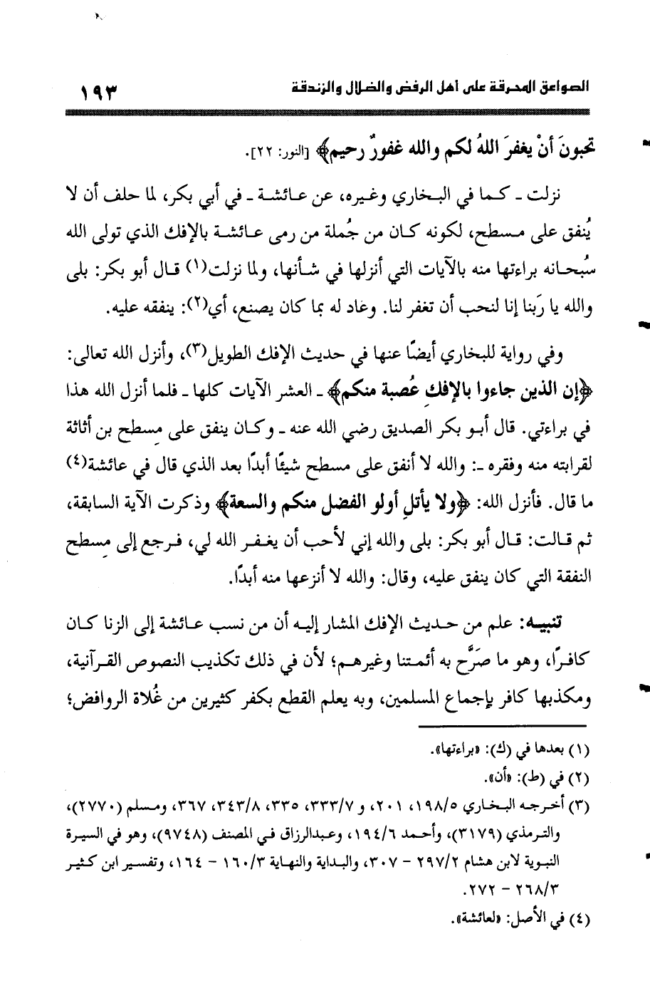 تَنْبِيه علم من حَدِيث الْإِفْك الْمشَار إِلَيْهِ أَن من نسب عَائِشَة إِلَى الزِّنَا كَانَ كَافِرًا وَهُوَ مَا صرح بِهِ أَئِمَّتنَا وَغَيرهم لِأَن فِي ذَلِك تَكْذِيب النُّصُوص القرآنية ومكذبها كَافِر بِإِجْمَاع الْمُسلمين وَبِه يعلم الْقطع بِكفْر كثيرين من غلاة الروافض