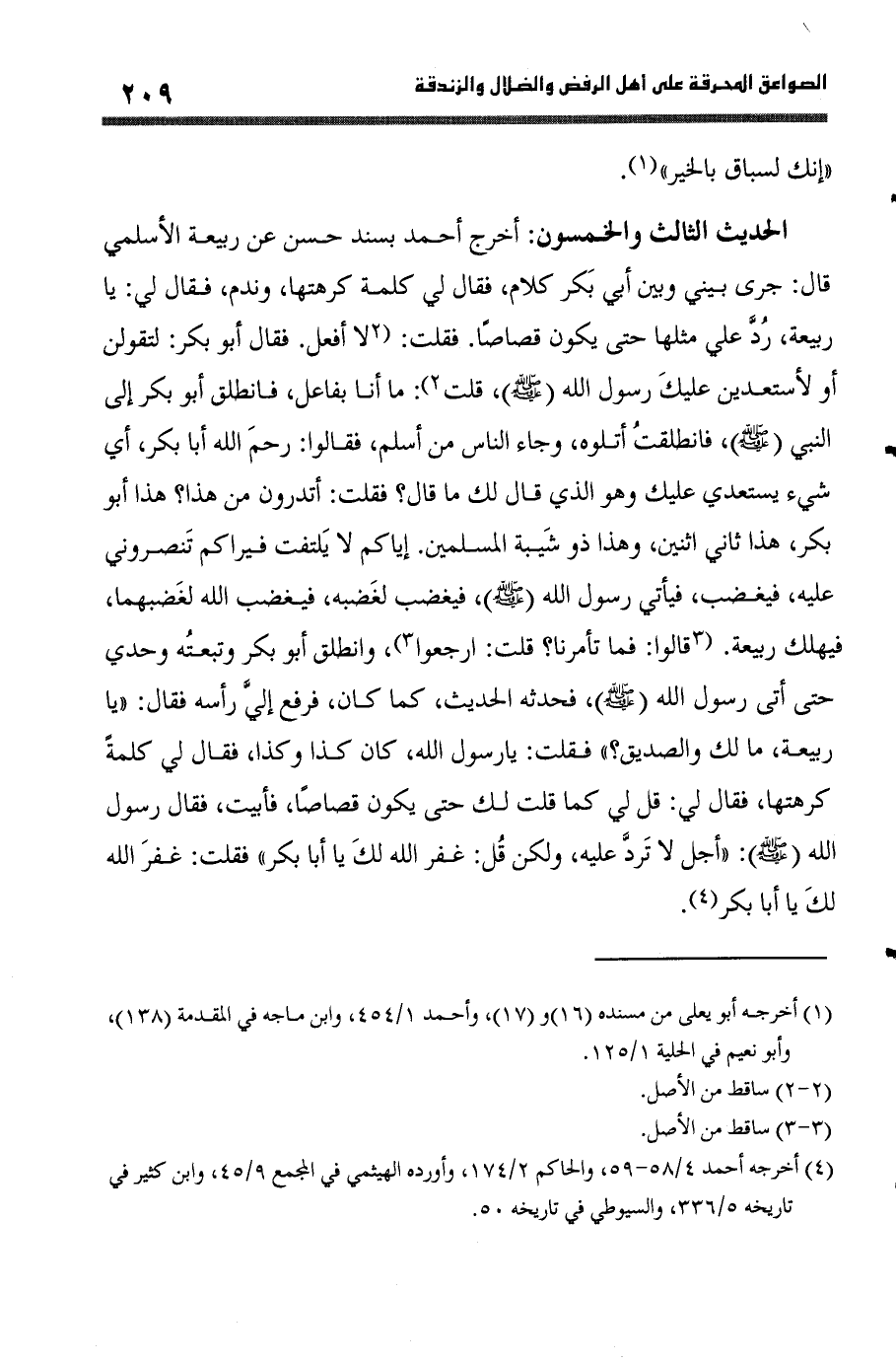 الحَدِيث الثَّالِث وَالْخَمْسُونَ أخرج أَحْمد // بِسَنَد حسن // عَن ربيعَة الْأَسْلَمِيّ قَالَ جرى بيني وَبَين أبي بكر كَلَام فَقَالَ لي كلمة كرهتها وَنَدم فَقَالَ لي يَا ربيعَة رد عَليّ مثلهَا حَتَّى يكون قصاصا فَقلت لَا افْعَل فَقَالَ أَبُو بكر لتقولن أَو لأستعدين عَلَيْك رَسُول الله صلى الله عَلَيْهِ وَسلم قلت مَا أَنا بفاعل فَانْطَلق أَبُو بكر إِلَى النَّبِي صلى الله عَلَيْهِ وَسلم فَانْطَلَقت أتلوه وَجَاء النَّاس من اسْلَمْ فَقَالُوا رحم الله أَبَا بكر أَي شَيْء يَسْتَعْدِي عَلَيْك وَهُوَ الَّذِي قَالَ لَك مَا قَالَ فَقلت أَتَدْرُونَ من هَذَا هَذَا أَبُو بكر هَذَا ثَانِي اثْنَيْنِ وَهَذَا ذُو شيبَة الْمُسلمين إيَّاكُمْ لَا يلْتَفت فيراكم تنصروني عَلَيْهِ فيغضب فَيَأْتِي رَسُول الله صلى الله عَلَيْهِ وَسلم فيغضب لغضبه فيغضب الله لغضبهما فَيهْلك ربيعَة قَالُوا فَمَا تَأْمُرنَا قلت ارْجعُوا وَانْطَلق أَبُو بكر وتبعته وحدي حَتَّى أَتَى رَسُول الله صلى الله عَلَيْهِ وَسلم فحدثه الحَدِيث كَمَا كَانَ فَرفع إِلَيّ رَأسه فَقَالَ (يَا ربيعَة مَا لَك وَالصديق) فَقلت يَا رَسُول الله كَانَ كَذَا وَكَذَا فَقَالَ لي كلمة كرهتها فَقَالَ لي قل لي كَمَا قلت لَك حَتَّى يكون قصاصا فأبيت فَقَالَ رَسُول الله صلى الله عَلَيْهِ وَسلم (أجل لَا ترد عَلَيْهِ وَلَكِن قل غفر الله لَك يَا أَبَا بكر) فَقلت غفر الله لَك يَا أَبَا بكر