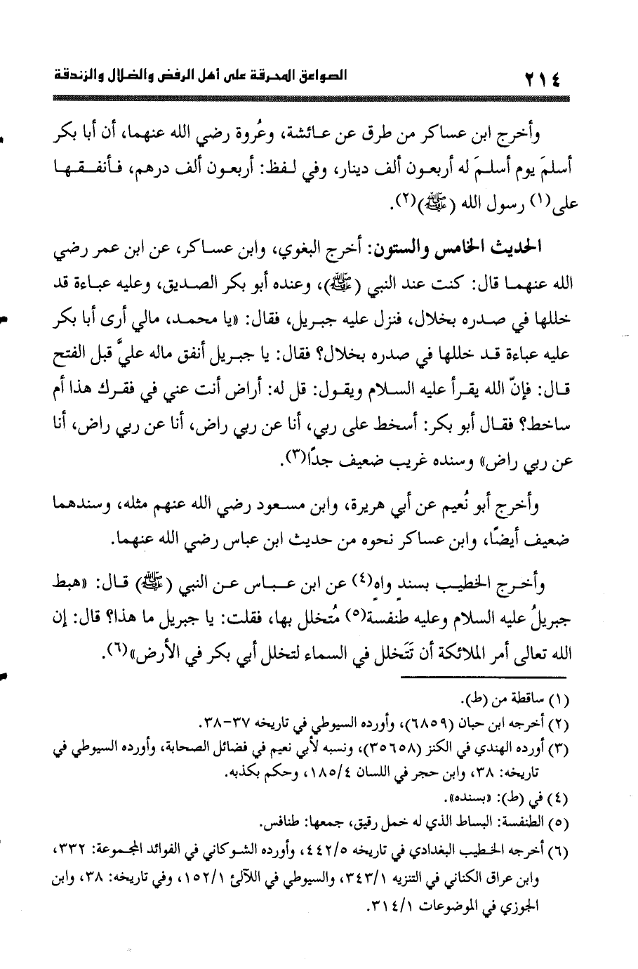 الحَدِيث الْخَامِس وَالسِّتُّونَ أخرج الْبَغَوِيّ وَابْن عَسَاكِر عَن ابْن عمر رَضِي الله عَنْهُمَا قَالَ كنت عِنْد النَّبِي صلى الله عَلَيْهِ وَسلم وَعِنْده ابو بكر الصّديق وَعَلِيهِ عباءة قد خللها فِي صَدره بخلال فَنزل عَلَيْهِ جِبْرِيل فَقَالَ يَا مُحَمَّد مَالِي أرى أَبَا بكر عَلَيْهِ عباءة قد خللها فِي صَدره بخلال فَقَالَ يَا جِبْرِيل أنْفق مَاله عَليّ قبل الْفَتْح قَالَ فَإِن الله يقْرَأ عَلَيْهِ السَّلَام وَيَقُول قل لَهُ أراض أَنْت عني فِي فقرك هَذَا أم ساخط فَقَالَ أَبُو بكر أَسخط على رَبِّي أَنا عَن رَبِّي رَاض أَنا عَن رَبِّي رَاض أَنا عَن رَبِّي رَاض) // وَسَنَده غَرِيب ضَعِيف جدا //