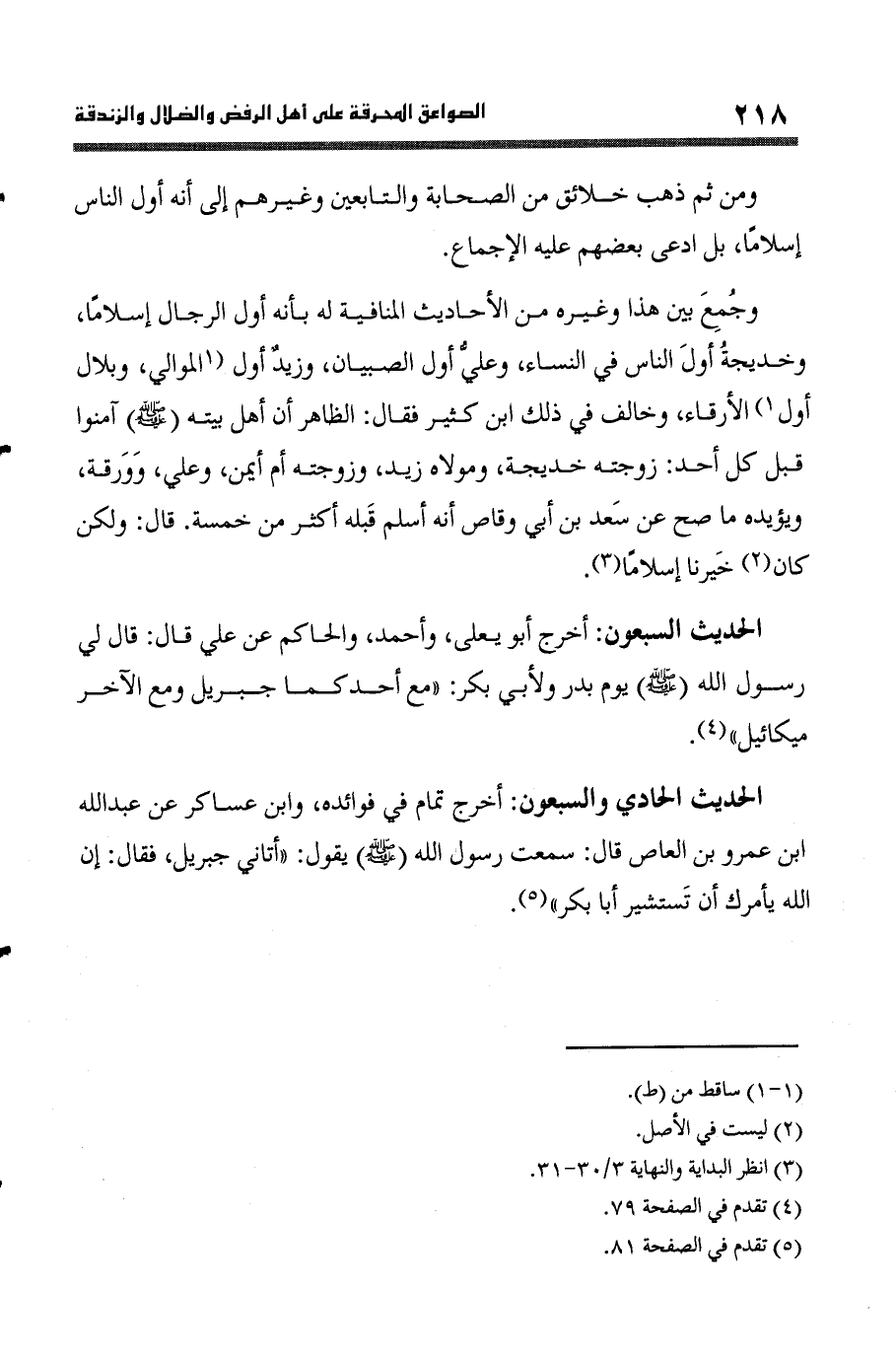 وَمن ثمَّ ذهب خلائق من الصَّحَابَة وَالتَّابِعِينَ وَغَيرهم إِلَى أَنه أول النَّاس إسلاما بل ادّعى بَعضهم عَلَيْهِ الْإِجْمَاع