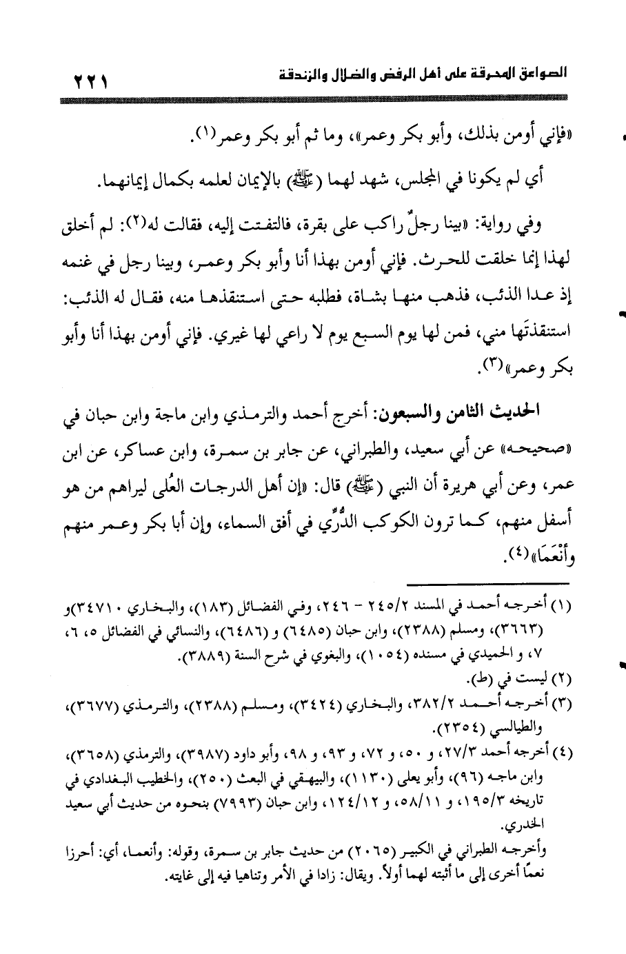 الحَدِيث الثَّامِن وَالسَّبْعُونَ أخرج أَحْمد وَالتِّرْمِذِيّ وَابْن ماجة وَابْن حبَان فِي صَحِيحه عَن أبي سعيد وَالطَّبَرَانِيّ عَن جَابر بن سَمُرَة وَابْن عَسَاكِر عَن ابْن عمر وَعَن أبي هُرَيْرَة أَن النَّبِي (ص) قَالَ (إِن أهل الدَّرَجَات العلى ليراهم من هُوَ أَسْفَل مِنْهُم كَمَا ترَوْنَ الْكَوْكَب الدُّرِّي فِي أفق السَّمَاء وَإِن أَبَا بكر وَعمر مِنْهُم وأنعما)