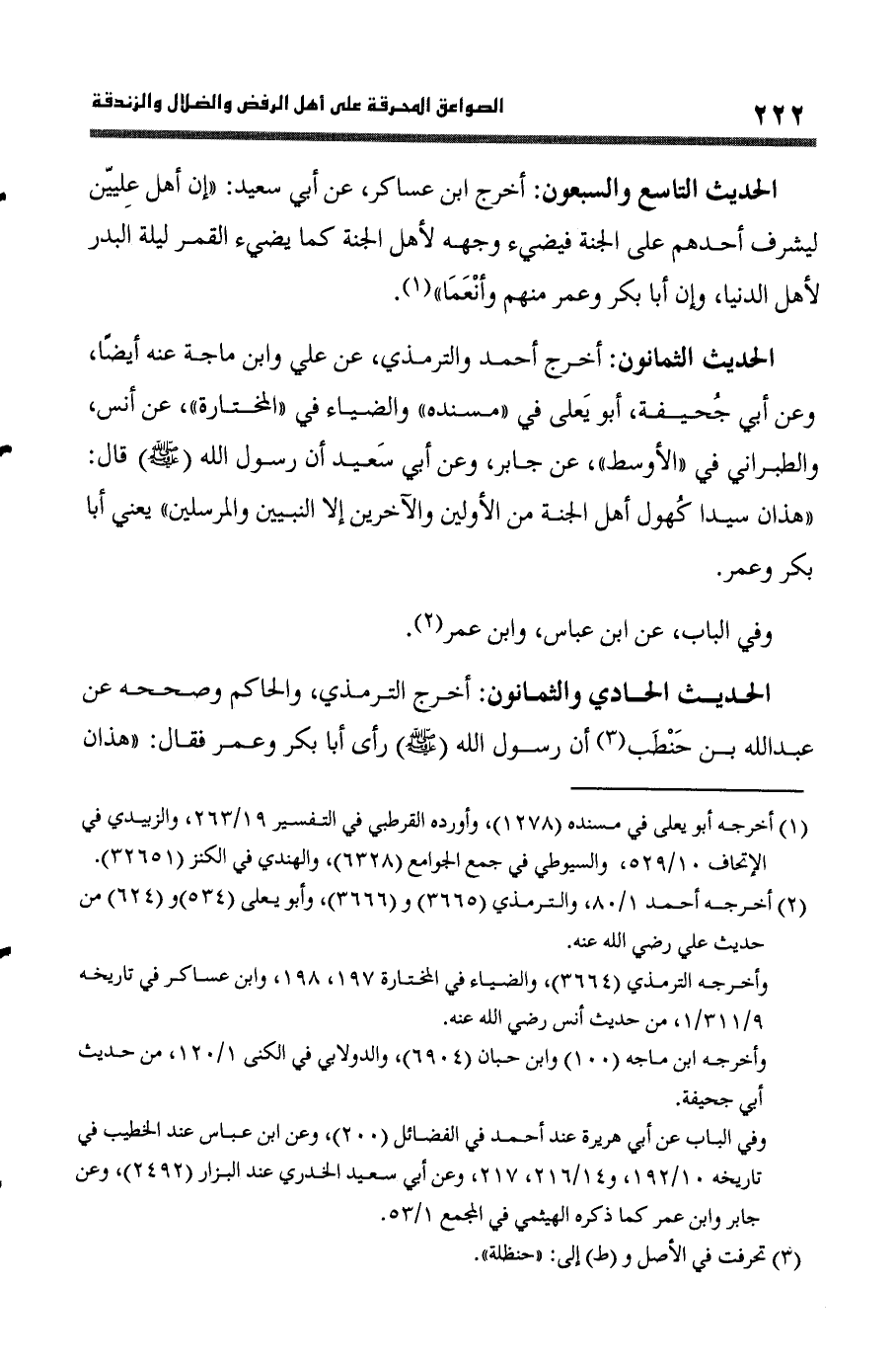 الحَدِيث الثَّمَانُونَ أخرج أَحْمد وَالتِّرْمِذِيّ عَن عَليّ وَابْن ماجة عَنهُ أَيْضا وَعَن أبي جُحَيْفَة أَبُو يعلى فِي مُسْنده والضياء فِي المختارة عَن أنس وَالطَّبَرَانِيّ فِي الْأَوْسَط عَن جَابر وَعَن أبي سعيد أَن رَسُول الله (صلى الله عَلَيْهِ وَسلم) قَالَ (هَذَانِ سيدا كهول أهل الْجنَّة من الْأَوَّلين والآخرين إِلَّا النَّبِيين وَالْمُرْسلِينَ) يَعْنِي أيا بكر وَعمر
