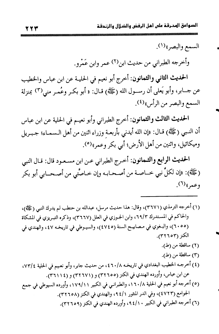الحَدِيث الثَّانِي وَالثَّمَانُونَ أخرج أَبُو نعيم فِي الْحِلْية عَن ابْن عَبَّاس والخطيب عَن جَابر وَأَبُو يعلى أَن رَسُول الله (صلى الله عَلَيْهِ وَسلم) قَالَ (أَبُو بكر وَعمر مني بِمَنْزِلَة السّمع وَالْبَصَر من الرَّأْس)