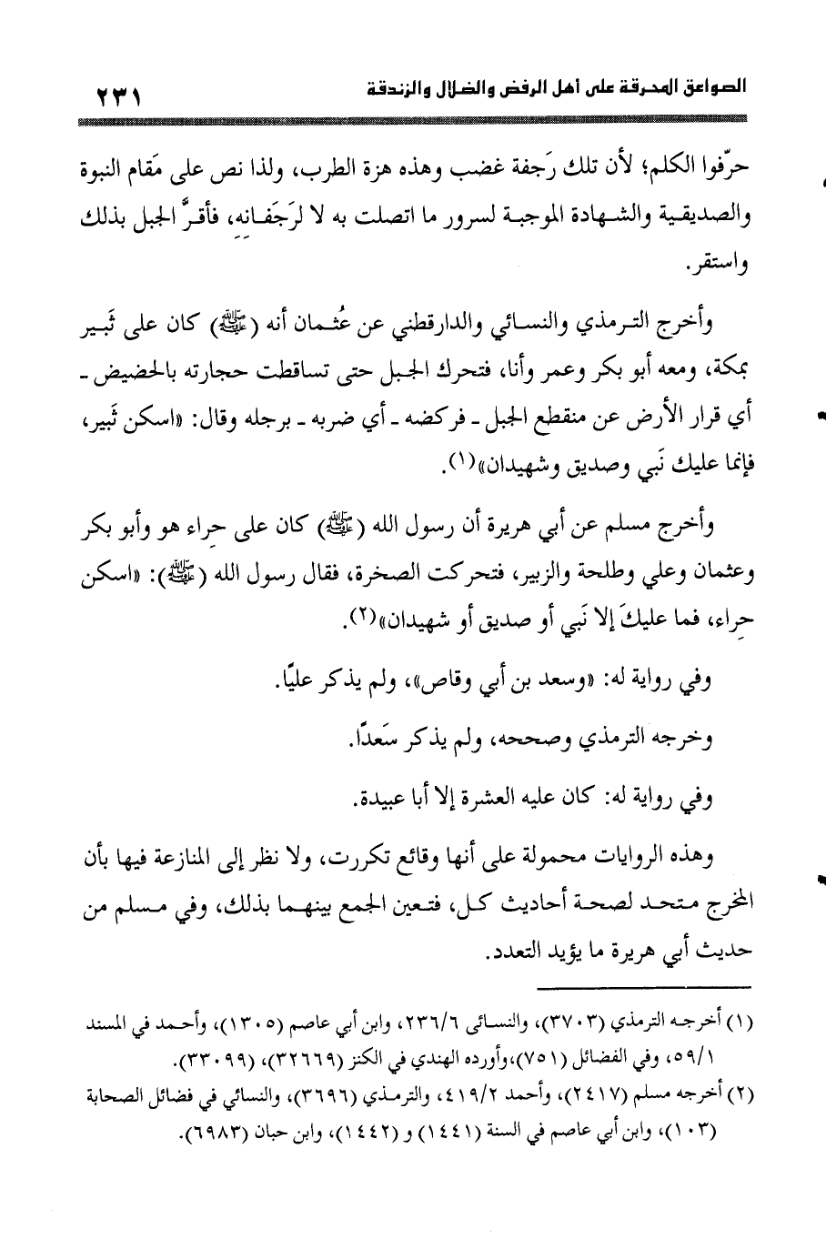 وَأخرج مُسلم عَن أبي هُرَيْرَة أَن رَسُول الله صلى الله عَلَيْهِ وَسلم كَانَ على حراء هُوَ وَأَبُو بكر وَعُثْمَان وَعلي وَطَلْحَة وَالزُّبَيْر فتحركت الصَّخْرَة فال رَسُول الله صلى الله عَلَيْهِ وَسلم (اسكن حراء فَمَا عَلَيْك إِلَّا نَبِي أَو صديق أَو شهيدان)