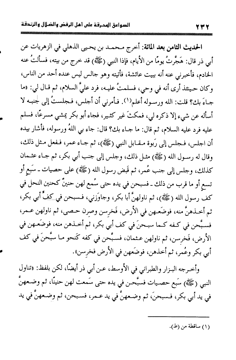 الحَدِيث الثَّامِن بعد الْمِائَة أخرج مُحَمَّد بن يحيى الذهلي فِي الزهريات عَن أبي ذَر قَالَ هجرت يَوْمًا من الْأَيَّام فَإِذا النَّبِي صلى الله عَلَيْهِ وَسلم قد خرج من بَيته فَسَأَلت عَنهُ الْخَادِم فَأَخْبرنِي عَنهُ أَنه بِبَيْت عَائِشَة فَأَتَيْته وَهُوَ جَالس لَيْسَ عِنْده أحد من النَّاس وَكَانَ حِينَئِذٍ أرى أَنه فِي وَحي فَسلمت عَلَيْهِ فَرد عَليّ السَّلَام ثمَّ قَالَ لي (مَا جَاءَ بك قلت الله وَرَسُوله أعلم فَأمرنِي أَن أَجْلِس فَجَلَست إِلَى جنبه لَا أسأله عَن شَيْء إِلَّا ذكره لي فَمَكثَ غير كثير فجَاء أَبُو بكر يمشي مسرعا فَسلم عَلَيْهِ فَرد عَلَيْهِ السَّلَام ثمَّ قَالَ (مَا جَاءَ بك قَالَ جَاءَ بِي الله وَرَسُوله فَأَشَارَ بِيَدِهِ أَن اجْلِسْ فَجَلَسَ إِلَى ربوة مُقَابل النَّبِي صلى الله عَلَيْهِ وَسلم ثمَّ جَاءَ عمر فَفعل مثل ذَلِك وَقَالَ لَهُ رَسُول الله صلى الله عَلَيْهِ وَسلم مثل ذَلِك وَجلسَ إِلَى جنب أبي بكر ثمَّ جَاءَ عُثْمَان كَذَلِك وَجلسَ إِلَى جنب عمر ثمَّ قبض رَسُول الله صلى الله عَلَيْهِ وَسلم على حَصَيَات سبع أَو تسع أَو مَا قرب من ذَلِك فسبحن فِي يَده حَتَّى سمع لَهُنَّ حنين كحنين النَّحْل فِي كف رَسُول الله صلى الله عَلَيْهِ وَسلم ثمَّ ناولهن أَبَا بكر وجاوزني فسبحن فِي كف أبي بكر ثمَّ أخذهن مِنْهُ فوضعهن فِي الأَرْض فخرسن وصرن حَصى ثمَّ ناولهن عمر فسبحن فِي كَفه كَمَا سبحن فِي كف أبي بكر ثمَّ أخذهن مِنْهُ فوضعهن فِي الأَرْض فخرسن ثمَّ ناولهن عُثْمَان فسبحن فِي كَفه كنحو مَا سبحن فِي كف أبي بكر وَعمر ثمَّ أخذهن فوضعهن فِي الأَرْض فخرسن)
