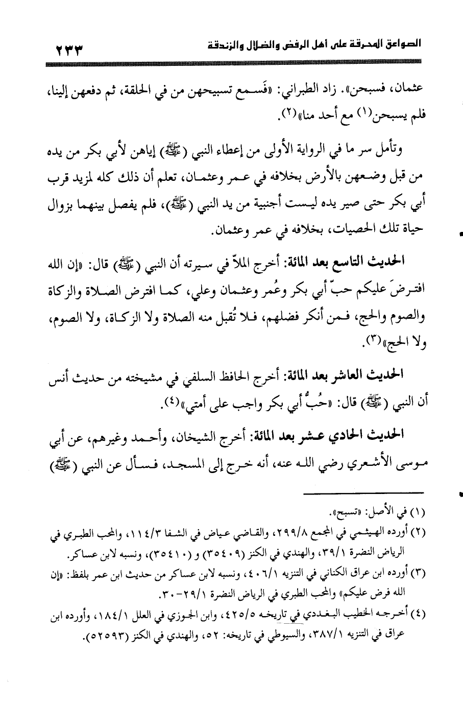 الحَدِيث التَّاسِع بعد الْمِائَة أخرج الملا فِي سيرته أَن النَّبِي صلى الله عَلَيْهِ وَسلم قَالَ (إِن الله افْترض عَلَيْكُم حب أبي بكر وَعمر وَعُثْمَان وَعلي كَمَا افْترض الصَّلَاة وَالزَّكَاة وَالصَّوْم وَالْحج فَمن أنكر فَضلهمْ فَلَا تقبل مِنْهُ الصَّلَاة وَلَا الزَّكَاة وَلَا الصَّوْم وَلَا الْحَج)