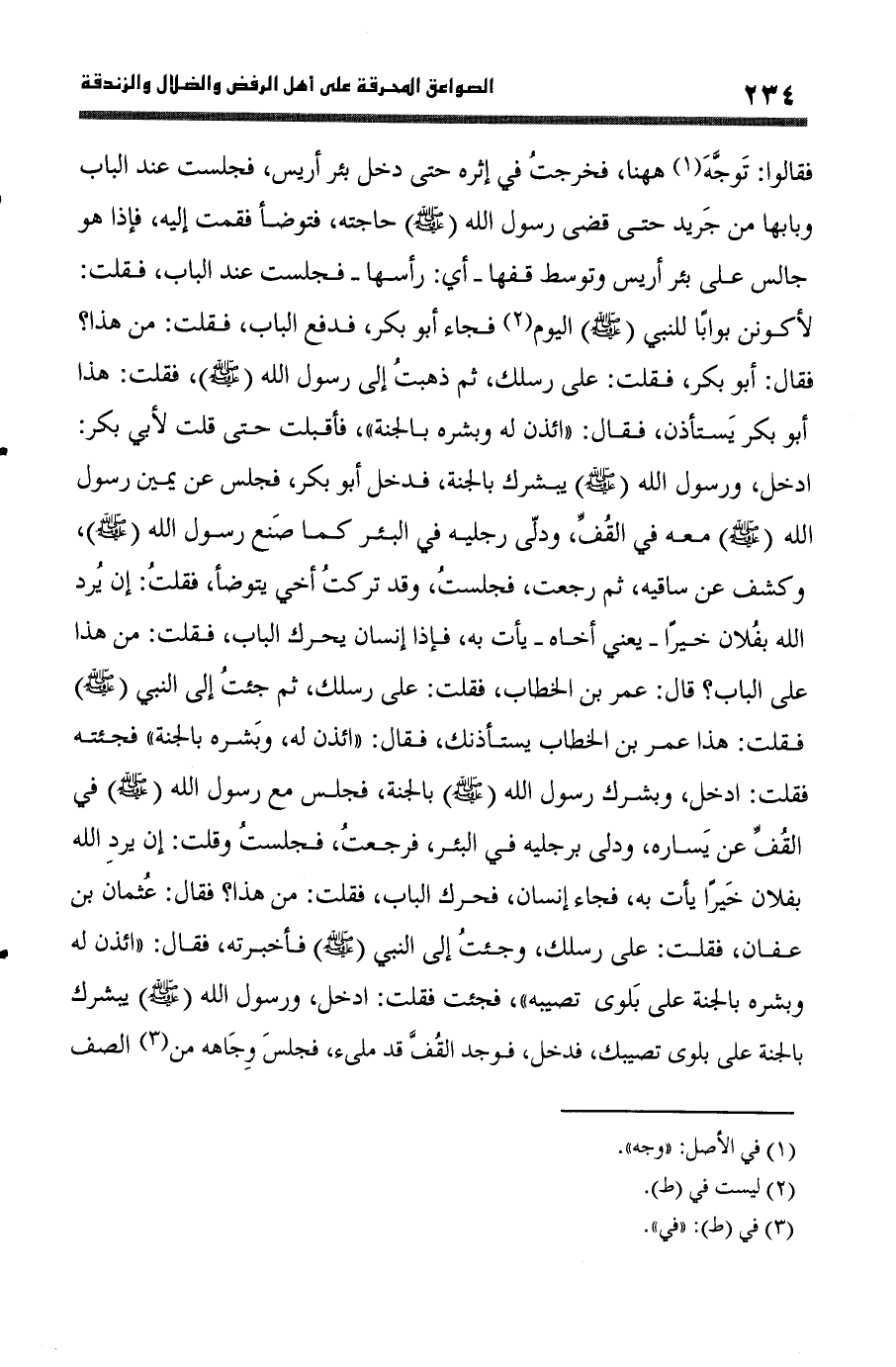 فَقَالُوا توجه هَهُنَا فَخرجت فِي إثره حَتَّى دخل بِئْر أريس فَجَلَست عِنْد الْبَاب وبابها من جريد حَتَّى قضى رَسُول الله صلى الله عَلَيْهِ وَسلم حَاجته فَتَوَضَّأ فَقُمْت إِلَيْهِ فَإِذا هُوَ جَالس على بِئْر أريس وتوسط قفها أَي رَأسهَا فَجَلَست عِنْد الْبَاب فَقلت لأكونن بوابا للنَّبِي صلى الله عَلَيْهِ وَسلم الْيَوْم فجَاء أَبُو بكر فَدفع الْبَاب فَقلت من هَذَا فَقَالَ أَبُو بكر فَقلت على رسلك ثمَّ ذهبت إِلَى رَسُول الله صلى الله عَلَيْهِ وَسلم فَقلت هَذَا أَبُو بكر يسْتَأْذن فَقَالَ (ائْذَنْ لَهُ وبشره بِالْجنَّةِ) فَأَقْبَلت حَتَّى قلت لأبي بكر ادخل وَرَسُول الله صلى الله عَلَيْهِ وَسلم يبشرك بِالْجنَّةِ فَدخل أَبُو بكر فَجَلَسَ عَن يَمِين رَسُول الله صلى الله عَلَيْهِ وَسلم مَعَه فِي القف ودلى رجلَيْهِ فِي الْبِئْر كَمَا صنع رَسُول الله صلى الله عَلَيْهِ وَسلم وكشف عَن سَاقيه ثمَّ رجعت فَجَلَست وَقد تركت أخي يتَوَضَّأ فَقلت إِن يرد الله بفلان خيرا يَعْنِي أَخَاهُ يَأْتِ بِهِ فَإِذا إِنْسَان يُحَرك الْبَاب فَقلت من هَذَا على الْبَاب قَالَ عمر بن الْخطاب فَقلت على رسلك ثمَّ جِئْت إِلَى النَّبِي صلى الله عَلَيْهِ وَسلم فَقلت هَذَا عمر بن الْخطاب يستأذنك فَقَالَ (ائْذَنْ لَهُ وبشره بِالْجنَّةِ) فَجِئْته فَقلت ادخل وبشرك رَسُول الله صلى الله عَلَيْهِ وَسلم بِالْجنَّةِ فَجَلَسَ مَعَ رَسُول الله صلى الله عَلَيْهِ وَسلم فِي القف عَن يسَاره ودلى برجليه فِي الْبِئْر فَرَجَعت فَجَلَست وَقلت إِن يرد الله بفلان خيرا يَأْتِ بِهِ فجَاء إِنْسَان فحرك الْبَاب فَقلت من هَذَا فَقَالَ عُثْمَان بن عَفَّان فَقلت على رسلك وَجئْت إِلَى النَّبِي صلى الله عَلَيْهِ وَسلم فَأَخْبَرته فَقَالَ (ائْذَنْ لَهُ وبشره بِالْجنَّةِ على بلوى تصيبه) فَجئْت فَقلت ادخل وَرَسُول الله صلى الله عَلَيْهِ وَسلم يبشرك بِالْجنَّةِ على بلوى تصيبك فَدخل فَوجدَ القف قد ملئ فَجَلَسَ وجاهه من الصَّفّ