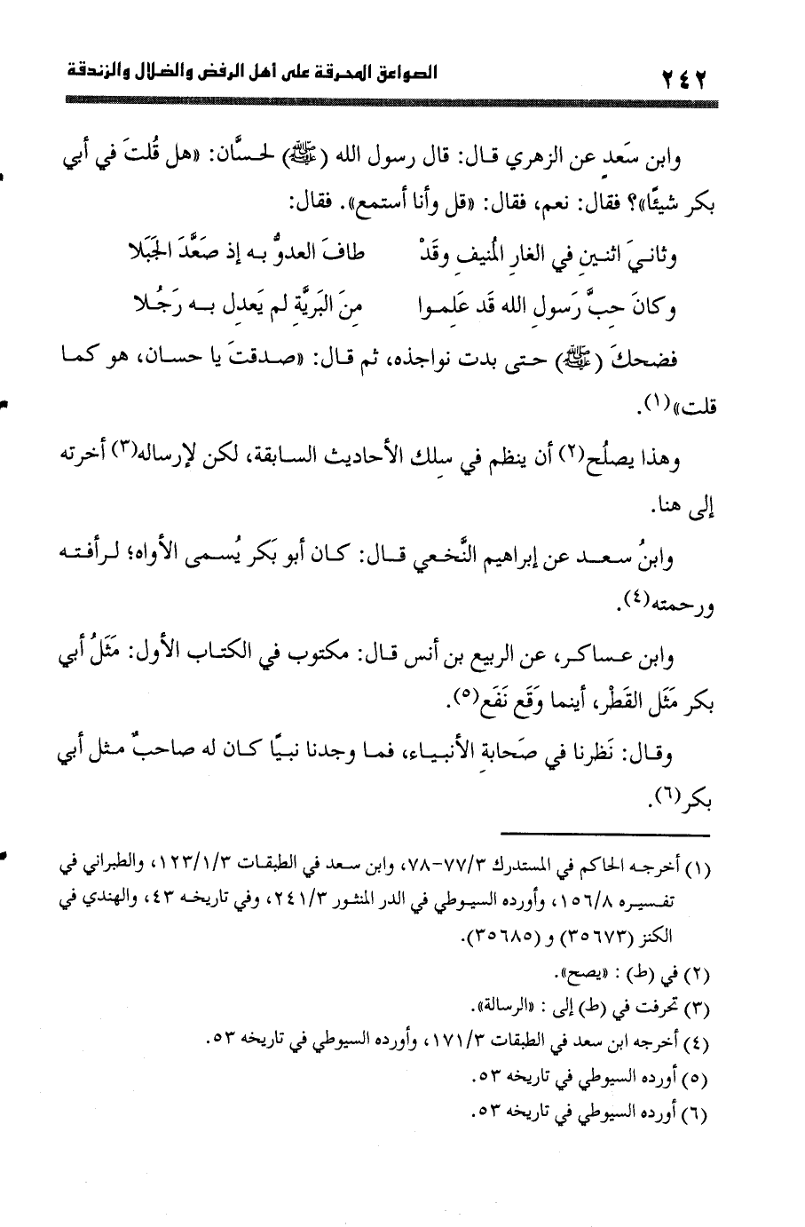 وَابْن سعد عَن الزُّهْرِيّ قَالَ قَالَ رَسُول الله صلى الله عَلَيْهِ وَسلم لحسان (هَل قلت فِي أبي بكر شَيْئا) فَقَالَ نعم فَقَالَ (قل وَأَنا أستمع) فَقَالَ